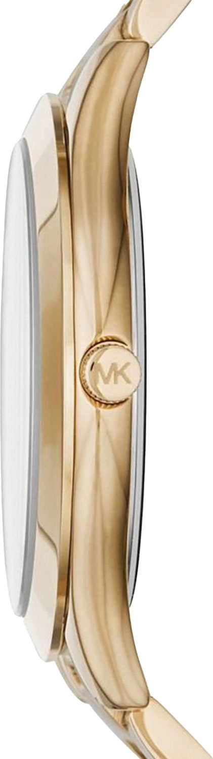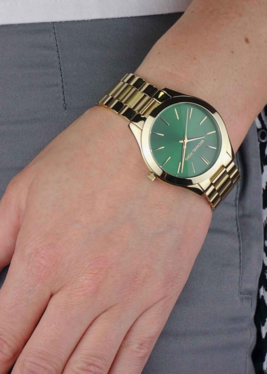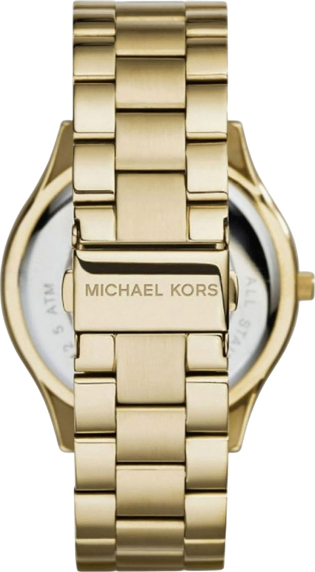 Женские кварцевые часы Runway Slim. Круглый стальной корпус. Циферблат выполнен по технологии Sunray (солнечные лучи) и защищен минеральным стеклом. Метки в виде штрихов. Клиновидные стрелки в стиле Dauphine. Рифленая заводная головка. Стальной браслет с раскладывающейся застежкой.