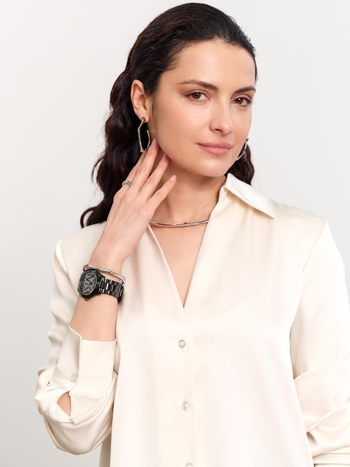 Эффектные наручные часы великолепно сочетают в себе роскошь и простоту. Женские кварцевые часы Slim Runway. Круглый стальной корпус с черным PVD покрытием. Циферблат без меток украшен кристаллами и защищен минеральным стеклом. Рифленая заводная головка. Стальной браслет с черным PVD покрытием и раскладывающейся застежкой.