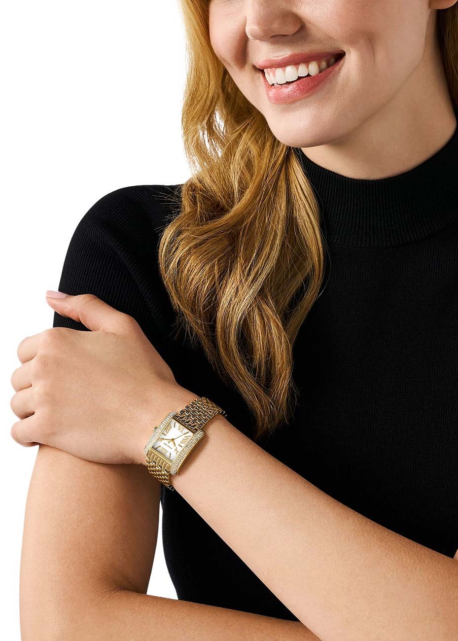 Женские часы Petite Emery. Прямоугольный корпус украшен кристалами. Циферблат выполнен по технологии Sunray (солнечные лучи) и защищен минеральным стеклом. Метки в виде римских цифр и штрихов. Рифленая заводная головка. Браслет с раскладывающейся застежкой.