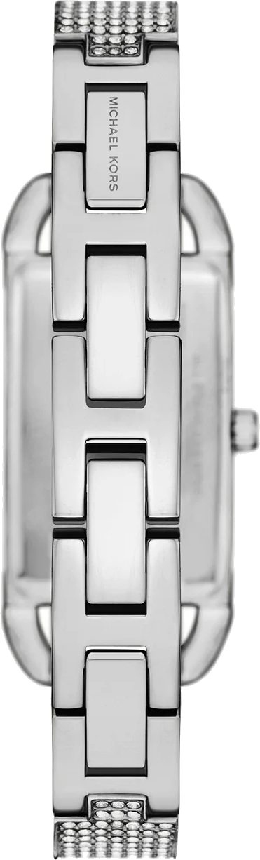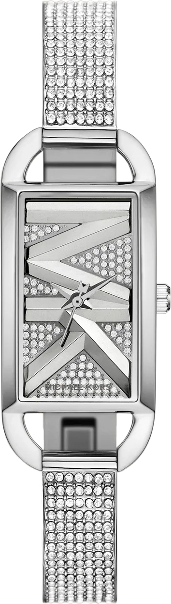 Эти дизайнерские часы — настоящее произведение искусства, которое добавит изысканности и элегантности в любой женский образ. Женские часы MK Empire. Прямоугольный стальной корпус. Циферблат без меток с логотипом бренда MK декорирован паве из кристаллов и защищен минеральным стеклом. Клиновидные стрелки в стиле Dauphine. Рифленая заводная головка. Стальной браслет с ювелирной застежкой декорирован паве из кристаллов.