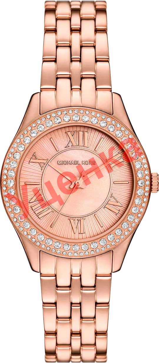 Женские кварцевые часы. Круглый стальной корпус с PVD покрытием цвета розового золота. Безель декорирован кристальным паве. Перламутровый по центру и декорированный узором в виде расходящихся лучей в зоне меток циферблат защищен минеральным стеклом. Метки в виде римских цифр и штрихов. Клиновидные стрелки в стиле Dauphine. Рифленая заводная головка. Стальной браслет с PVD покрытием цвета розового золота и раскладывающейся застежкой с двумя кнопками.