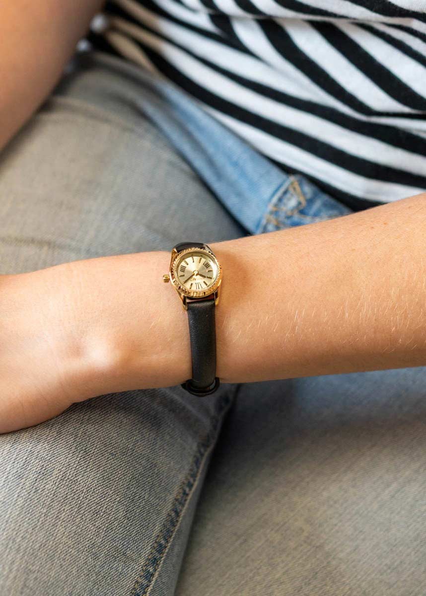 Женские наручные часы. Миниатюрный круглый стальной корпус. Рифленый безель. Циферблат выполнен по технологии Sunray (солнечные лучи) и защищен минеральным стеклом.