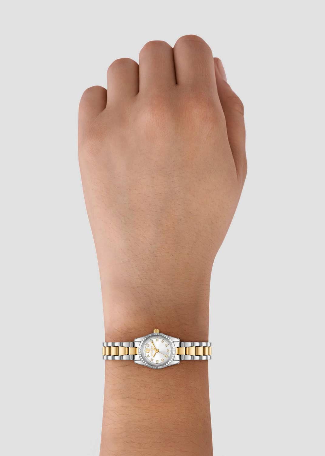 Женские наручные часы. Миниатюрный круглый стальной корпус. Рифленый безель. Циферблат выполнен по технологии Sunray (солнечные лучи) и защищен минеральным стеклом.