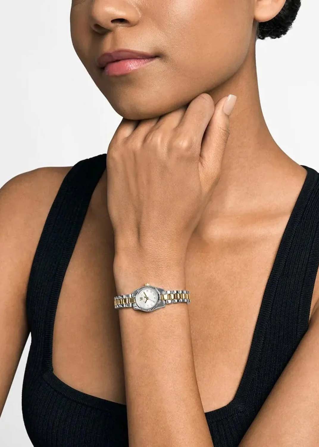 Метки в виде точек с кристаллами и римской цифры XII. Рифленая заводная головка. Браслет с раскладывающейся застежкой.