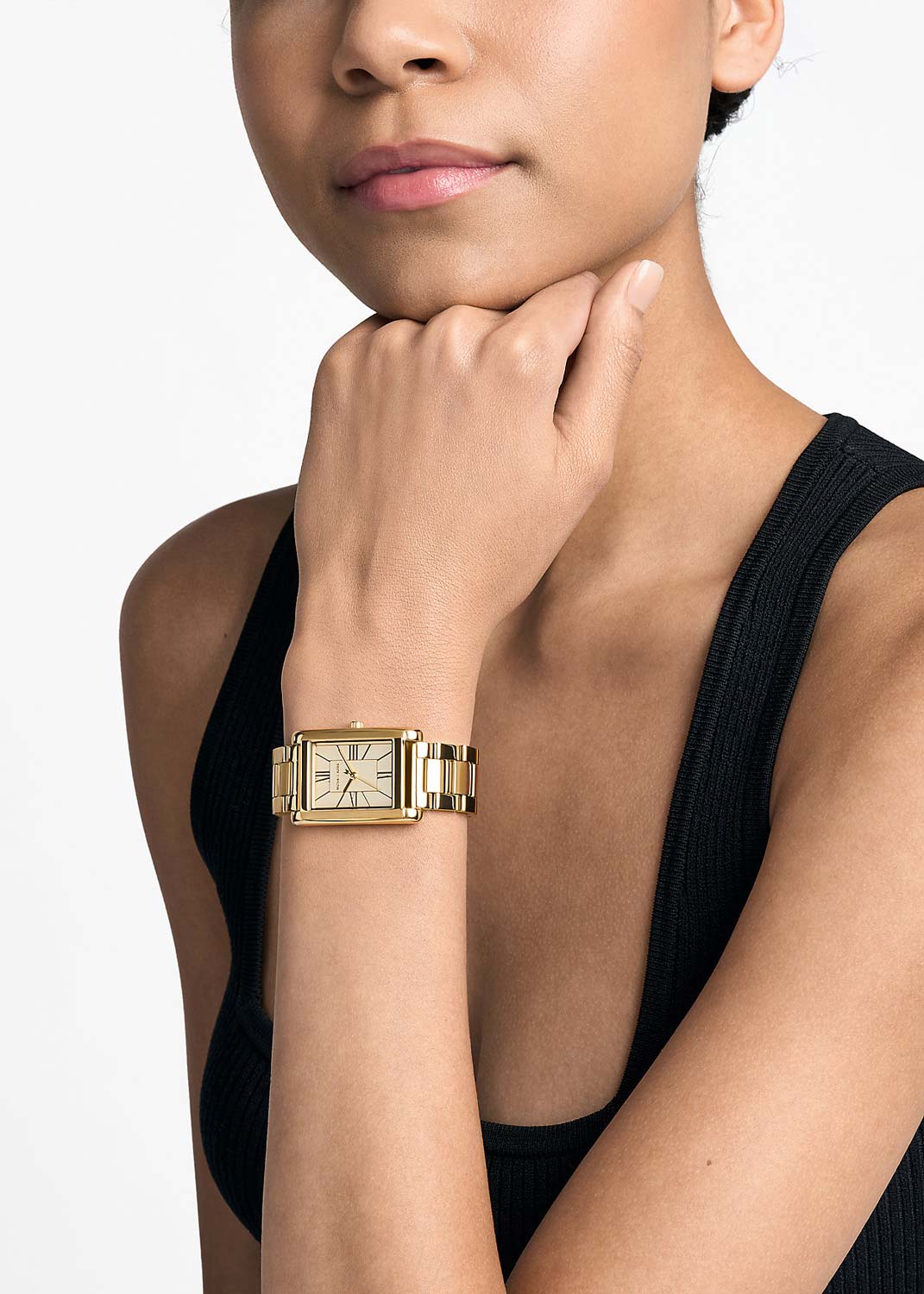 Женские часы Essex. Стальной прямоугольный корпус. Циферблат защищен минеральным стеклом. Метки в виде римских цифр и штрихов. Рифленая заводная головка. Браслет с раскладывающейся застежкой.
