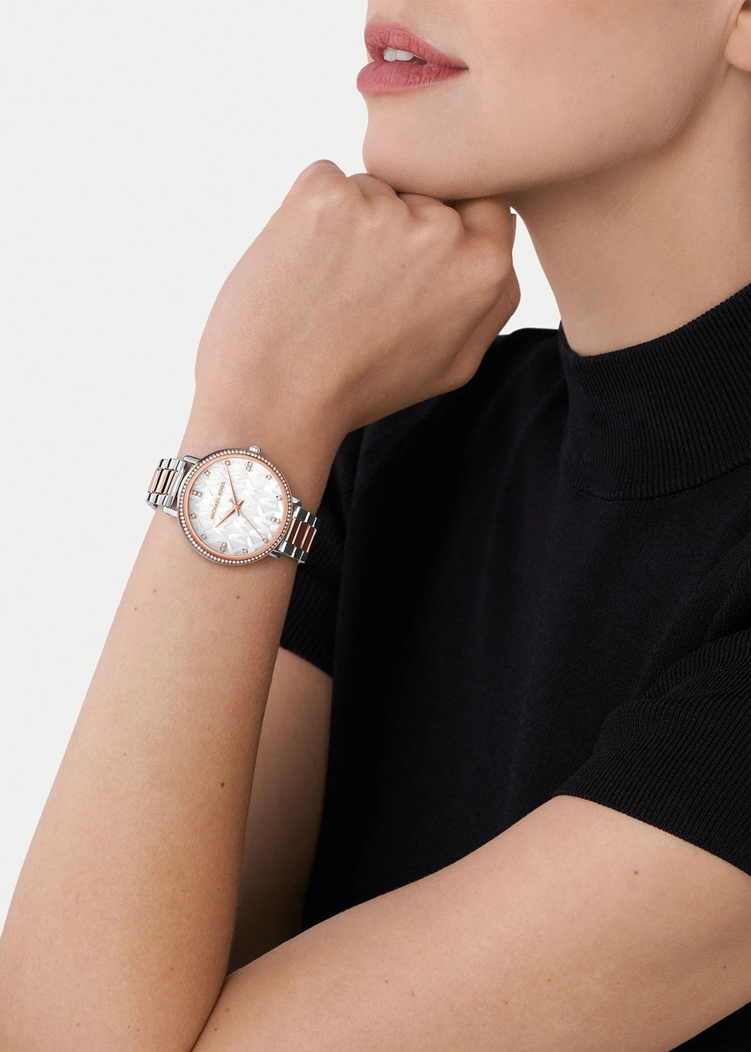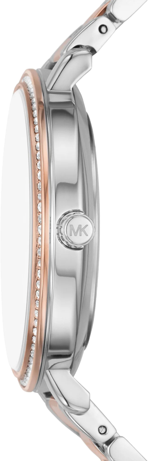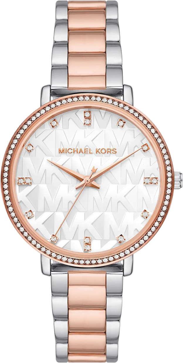 Женские наручные часы. Круглый стальной корпус. Безель инкрустирован кристаллами. Циферблат декорирован принтом ''MK'' и защищен минеральным стеклом.