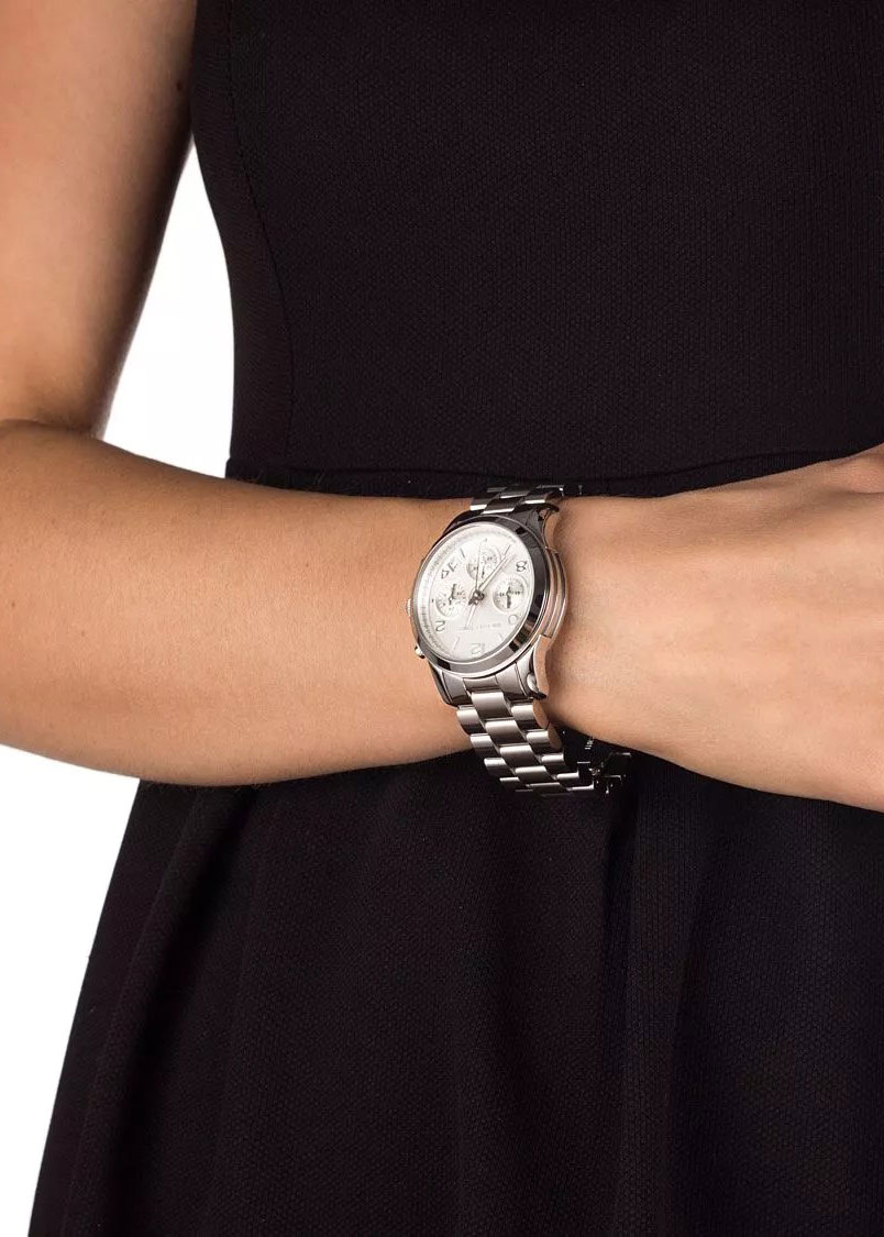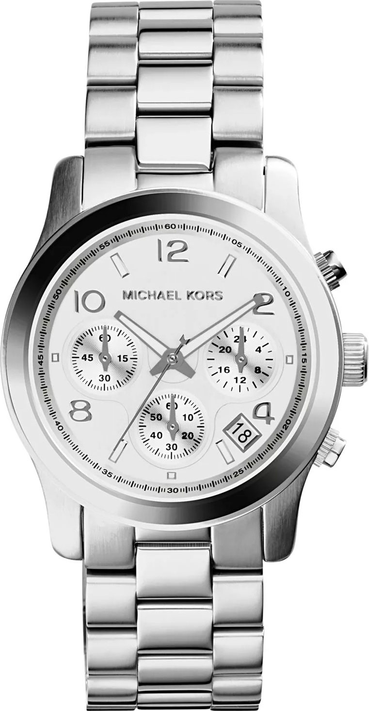 Женские часы-хронограф Runway с секундомером. 12-ти и 24-х часовой формат времени. Метки в виде арабских цифр и штрихов. Окошко даты находится между отметками 4 и 5 часов. Рифленая заводная головка. Стальной браслет с раскладывающейся застежкой.