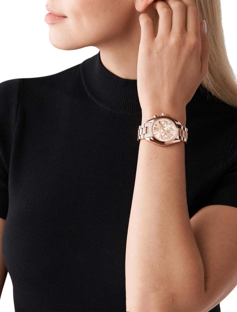 Женские кварцевые часы-хронограф с секундомером Bradshaw Mini. Круглый стальной корпус с розовым PVD покрытием. Циферблат с минутной шкалой выполнен по технологии Sunray (солнечные лучи) и защищен минеральным стеклом. Метки в виде штрихов и римских цифр. 12-ти и 24-х часовой формат времени. Окошко даты находится между отметками 4 и 5 часов. Рифленая заводная головка с защитой. Надежный стальной браслет с розовым PVD покрытием и раскладывающейся застежкой с двумя кнопками.