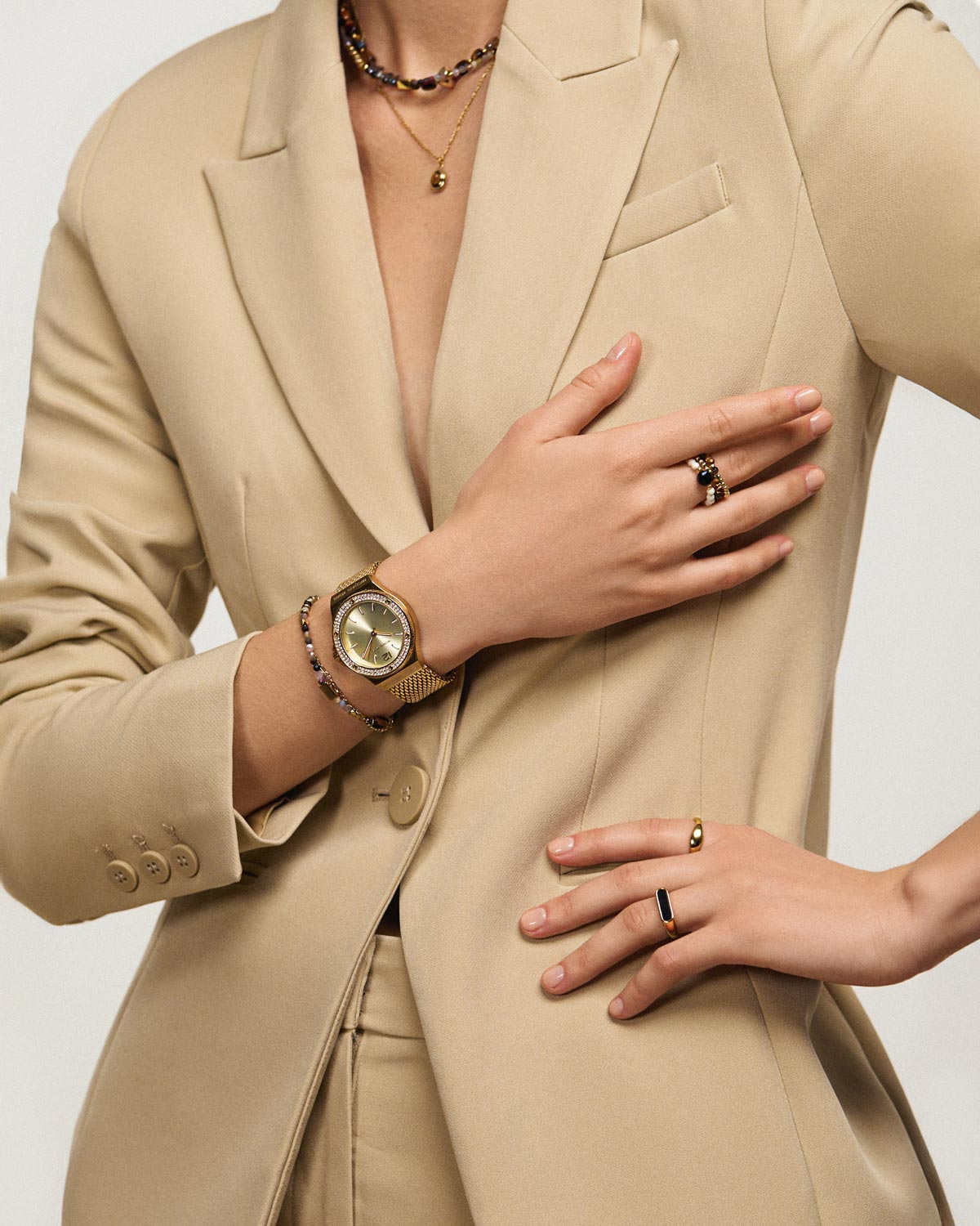 Ослепительный аксессуар подчеркнет вашу индивидуальность и привлечет внимание окружающих. Женские часы с круглым стальным корпусом Lennox Pave. Циферблат выполнен по технологии Sunray (солнечные лучи). Метки в виде штрихов и арабской цифры 12. Безель украшен кристальным паве. Рифленая заводная головка с защитой. Браслет миланского плетения.
