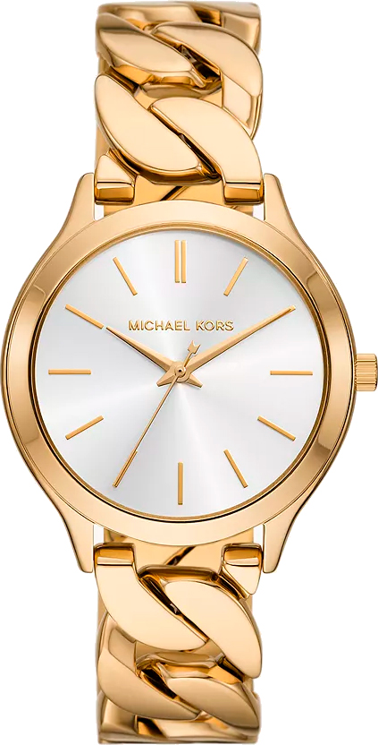 Часы для женщин, которые любят стильные аксессуары и следят за модными тенденциями. Женские кварцевые часы Runway Slim. Круглый стальной корпус с PVD покрытием цвета желтого золота. Циферблат выполнен по технологии Sunray (солнечные лучи) и защищен минеральным стеклом. Метки в виде штрихов. Клиновидные стрелки в стиле Dauphine. Рифленая заводная головка. Стальной браслет с PVD покрытием цвета желтого золота в виде массивной цепочки панцирного плетения и ювелирной застежкой.