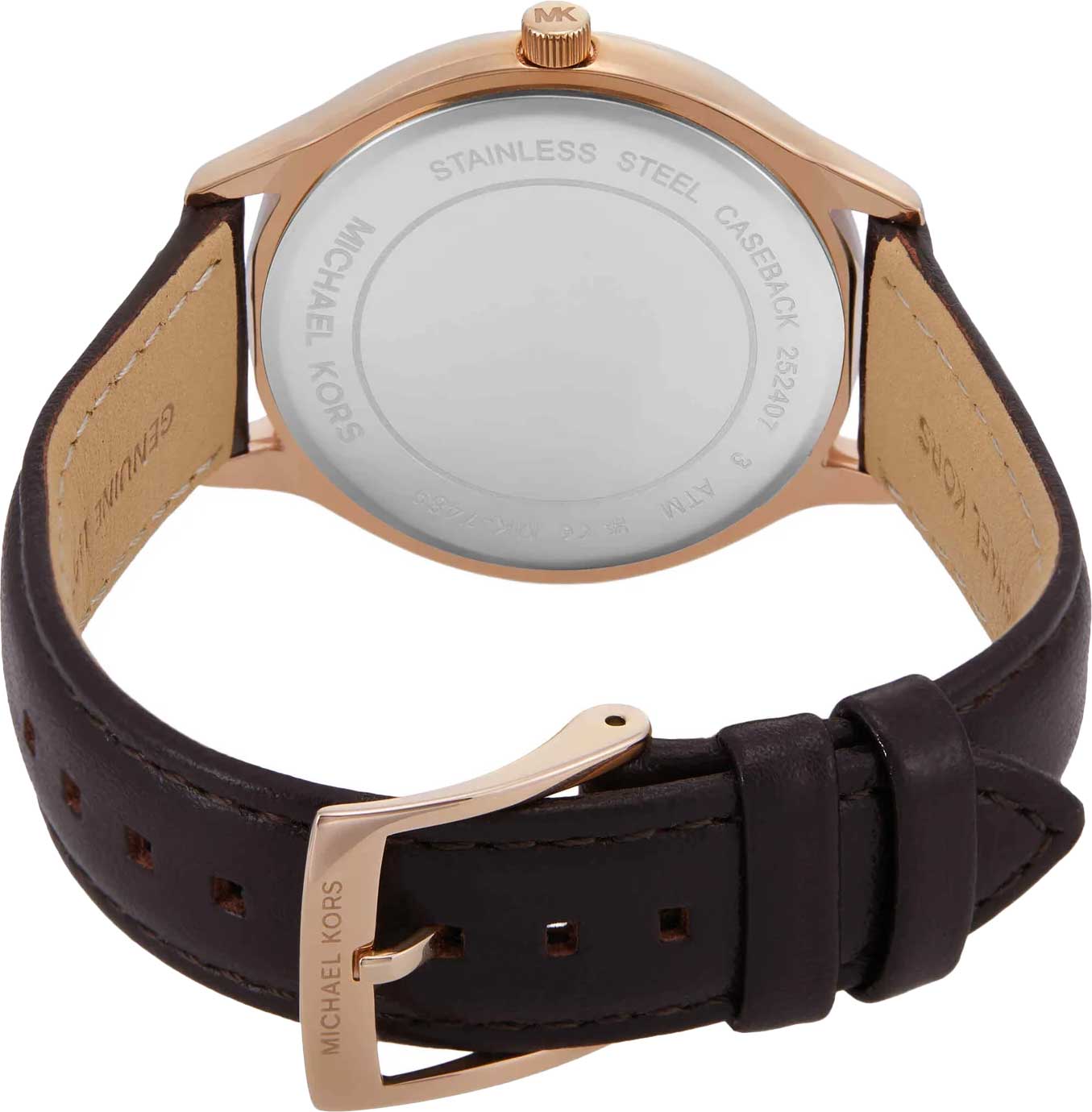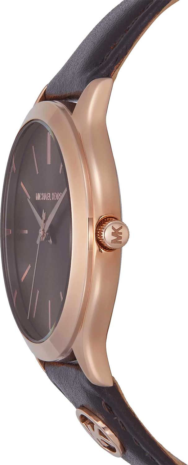 Ультратонкие женские часы Slim Runway в круглом стальном корпусе. Циферблат выполнен по технологии Sunray (солнечные лучи). Метки в виде штрихов. Кожаный ремешок со стальной вставкой в виде логотипа бренда MK и классической застежкой.