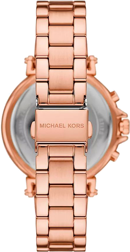 Женские часы-хронограф с секундомером Maren в круглом стальном корпусе цвета розового золота. Безель с логотипом бренда Michael Kors. Циферблат выполнен по технологии Sunray (солнечные лучи). По краю циферблата нанесена минутная шкала. Метки в виде штрихов и арабской цифры 12. 12-ти и 24-х часовой формат времени.