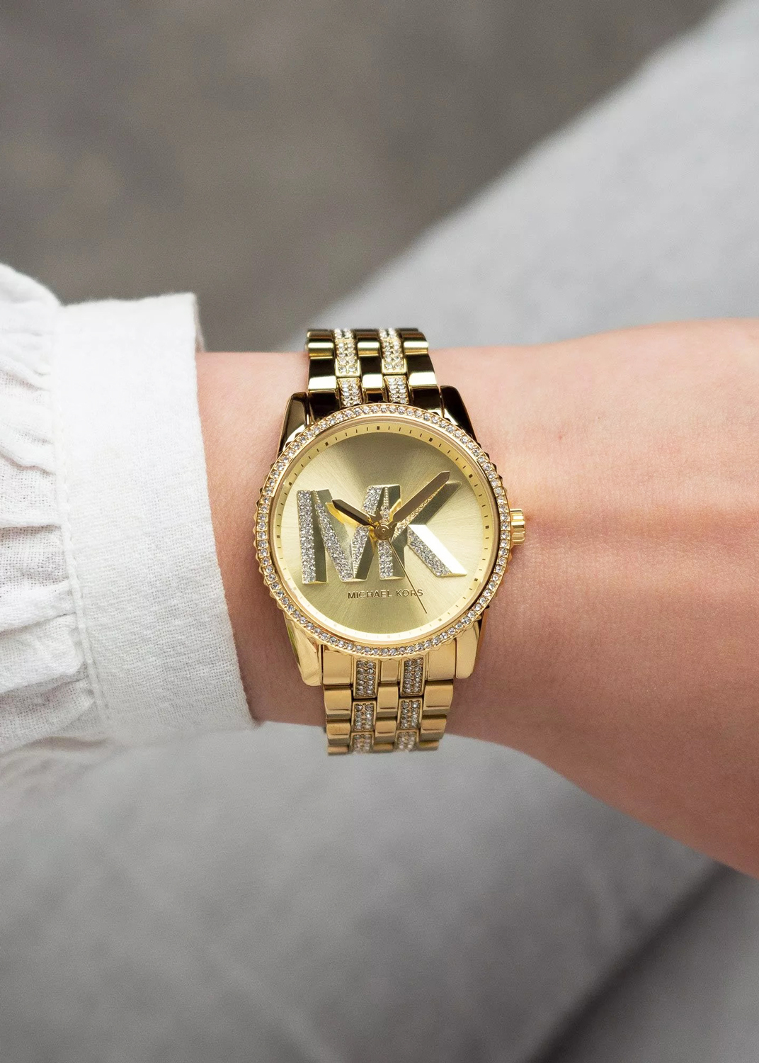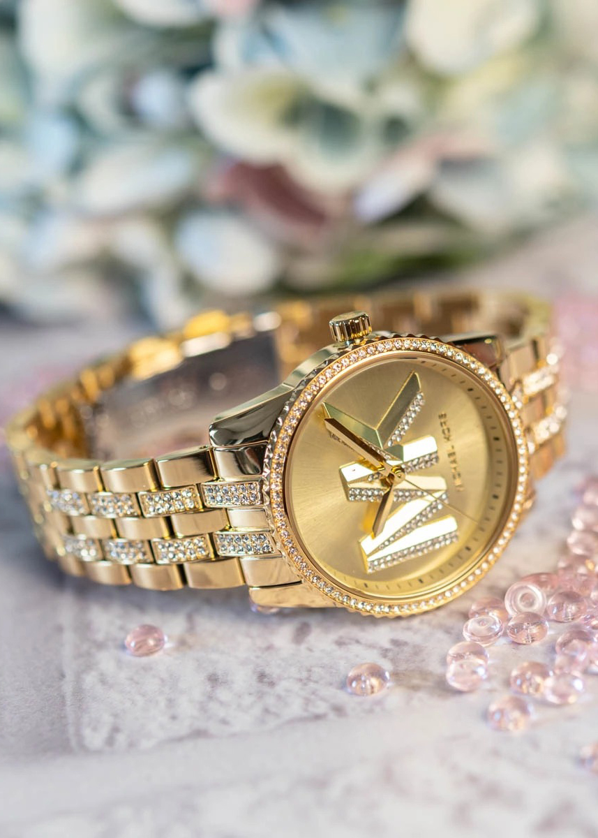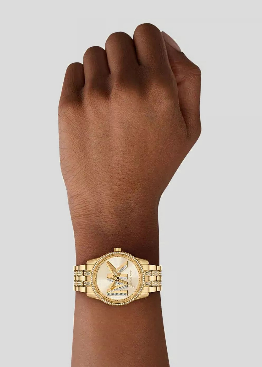 Женские наручные часы. Круглый стальной корпус. Рифленый безель инкрустирован кристаллами. Циферблат с инициалами ''MK'' выполнен по технологии Sunray (солнечные лучи) и защищен минеральным стеклом.