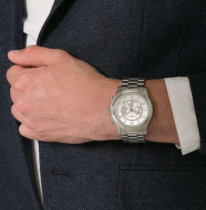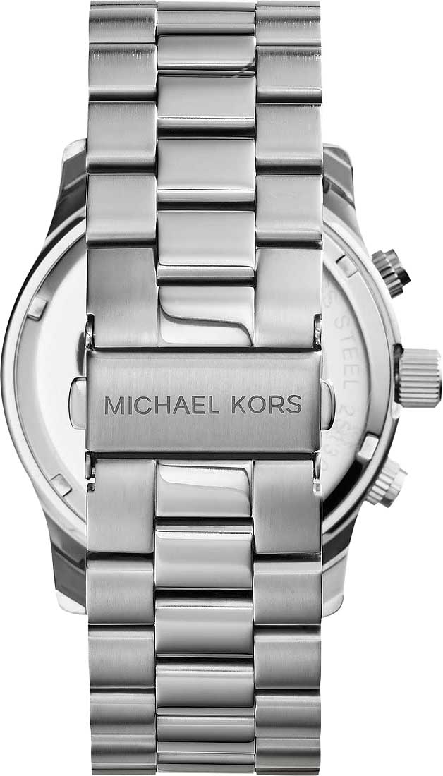Runway. Часы-хронограф с секундомером. Круглый стальной корпус. 12-ти и 24-х часовой формат времени. Циферблат с метками в виде штрихов и арабских цифр. Окошко даты находится в положении между отметками 4 и 5 часов. Браслет с раскладывающейся застежкой.