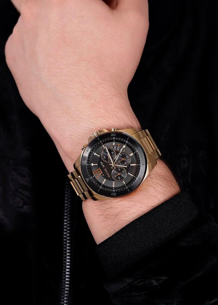 Часы-хронограф Brecken с секундомером. 12-ти и 24-х часовой формат времени. Метки в виде штрихов и римской цифры 12. Люминесцентные стрелки и метки, которые светятся в темноте после непродолжительной зарядки на свету. Окошко даты находится в положении между отметками 4 и 5 часов. Заводная головка с защитой. Браслет с раскладывающейся застежкой.