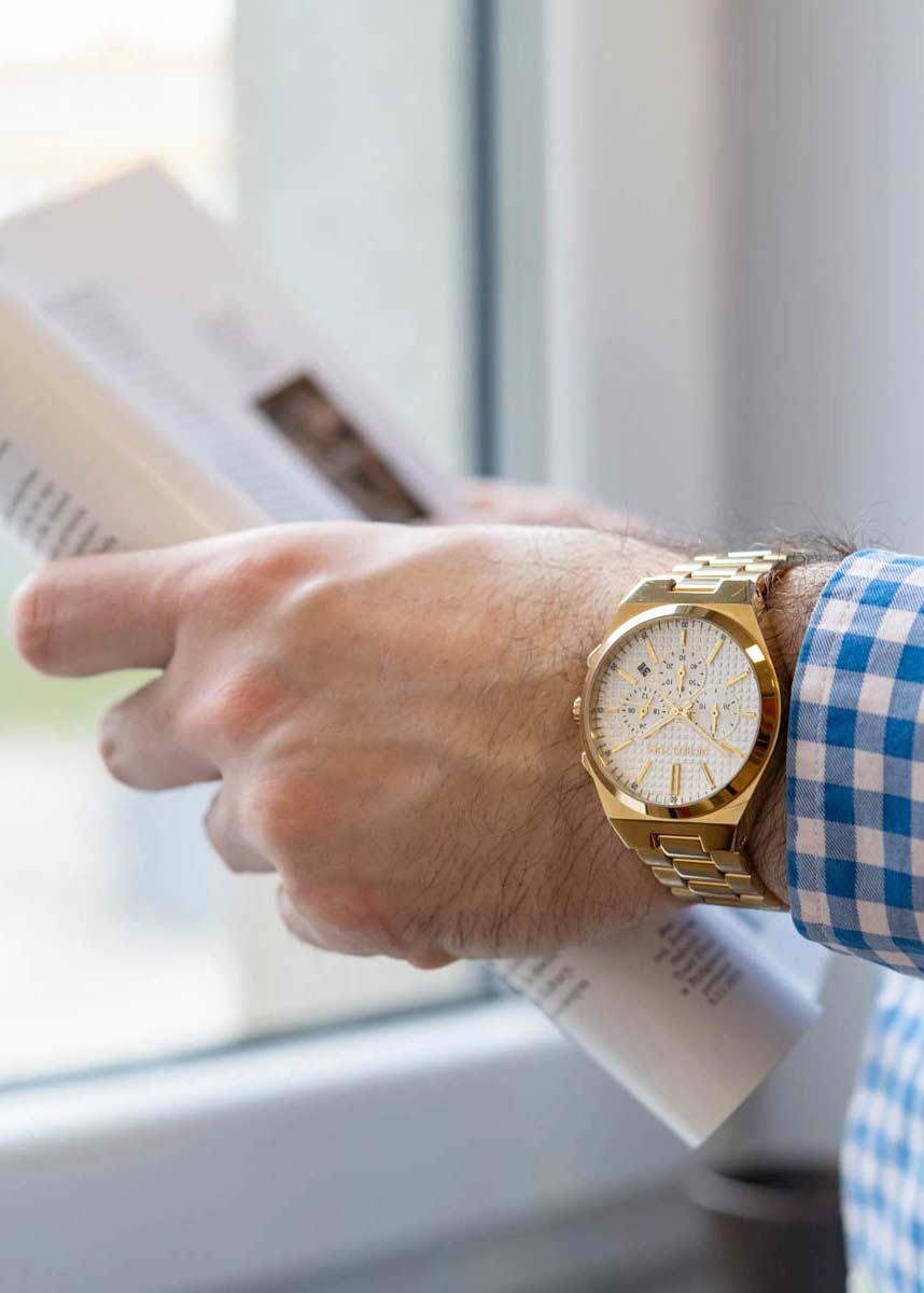 Мужские часы-хронограф с секундомером. 12-ти и 24-х часовой формат времени. Круглый стальной корпус. Циферблат с рисунком в клетку защищен минеральным стеклом. Метки в виде штрихов.