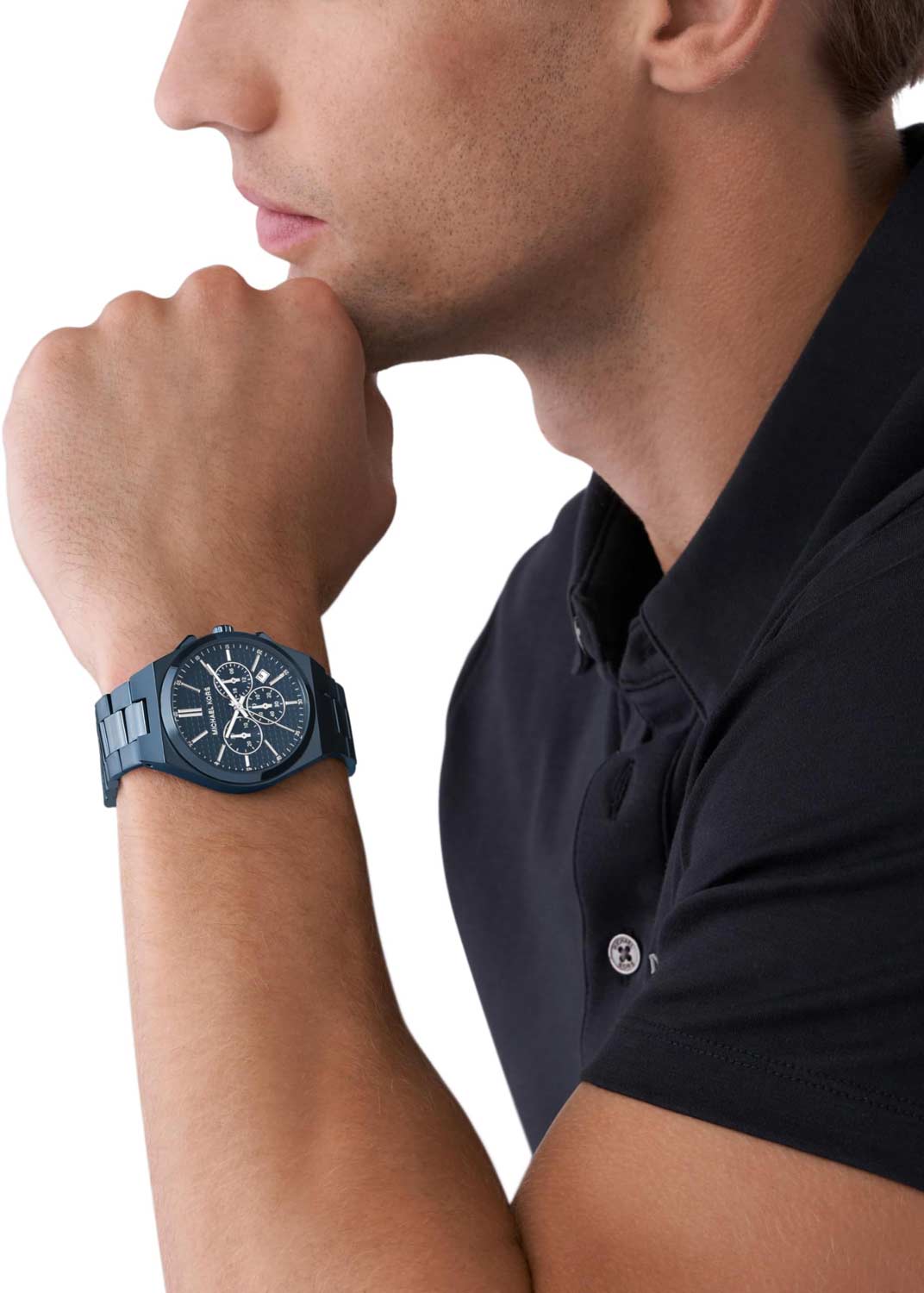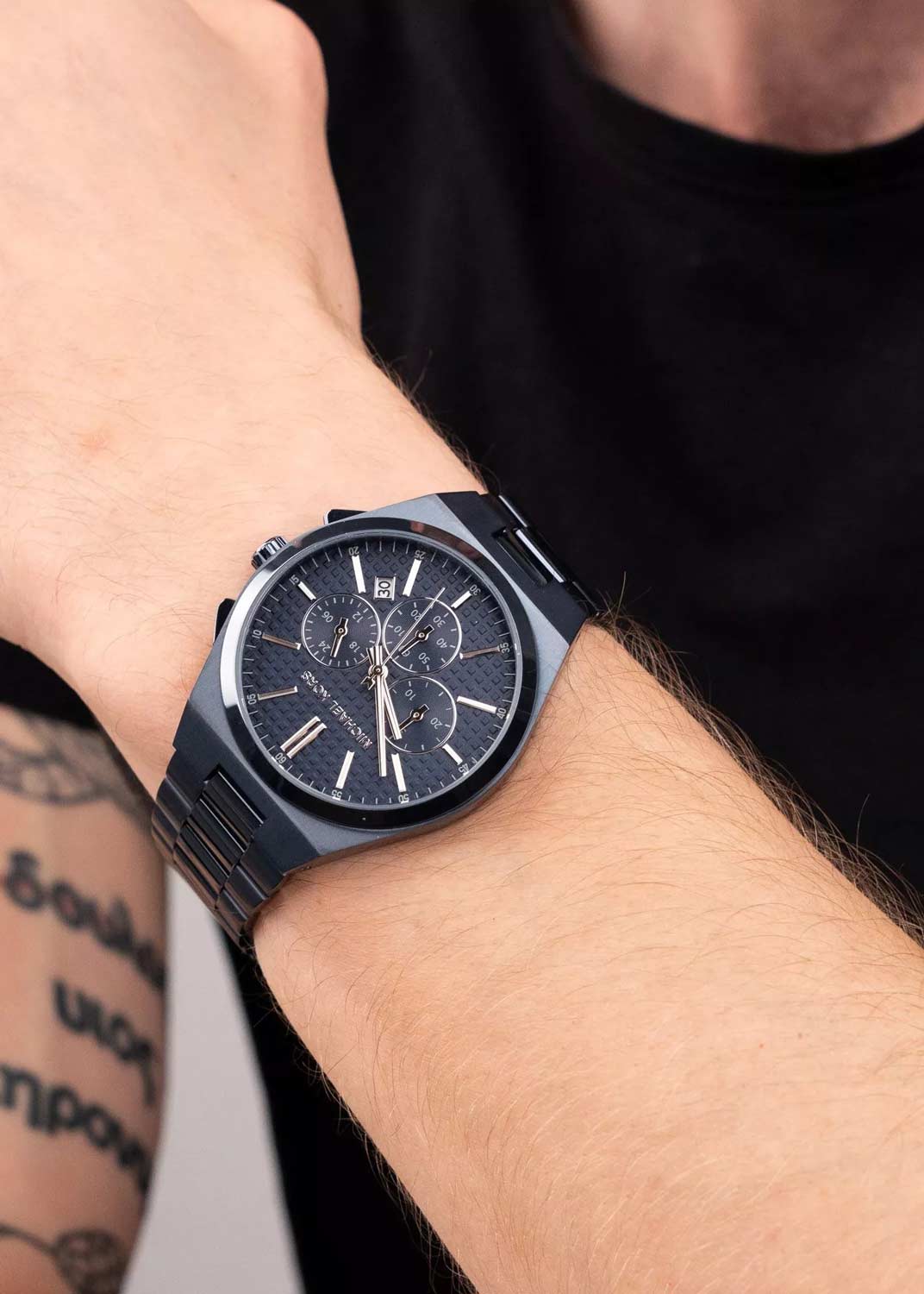 Мужские часы-хронограф с секундомером. 12-ти и 24-х часовой формат времени. Круглый стальной корпус. Циферблат с рисунком в клетку защищен минеральным стеклом. Метки в виде штрихов.
