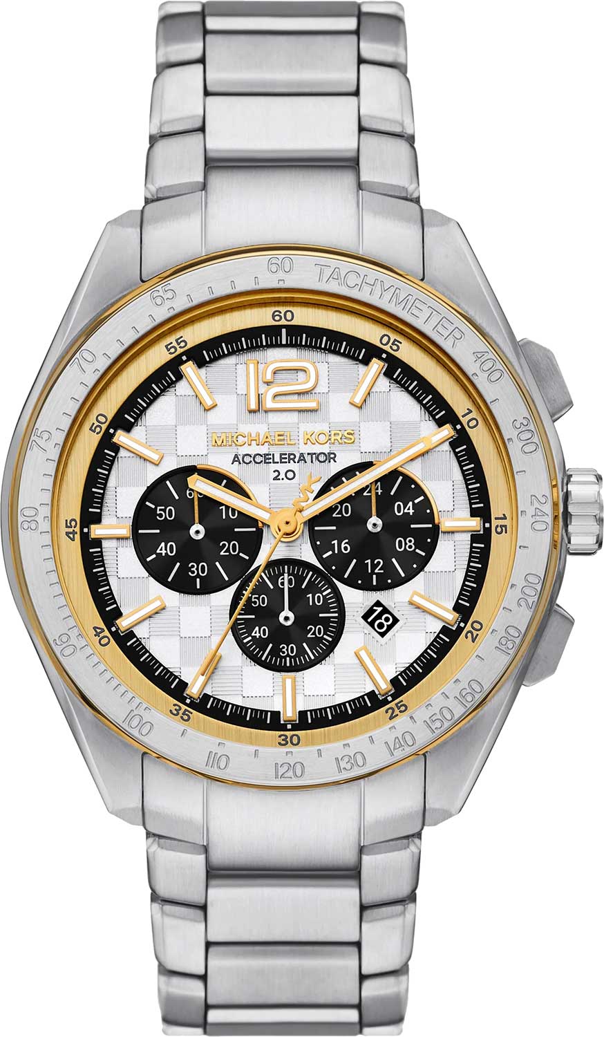 Часы-хронограф с секундомером и тахиметром Accelerator 2.0. 12-ти и 24-х часовой формат времени. Циферблат защищен минеральным стеклом. Метки в виде штрихов и арабской цифры 12. Окошко даты находится в положении между отметками 4 и 5 часов. Рифленая заводная головка. Браслет с раскладывающейся застежкой.