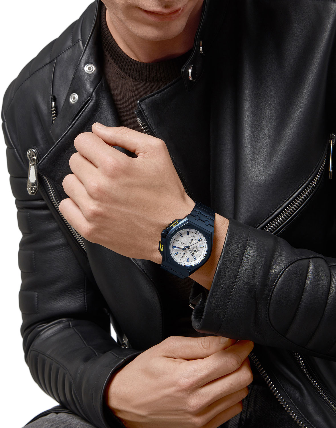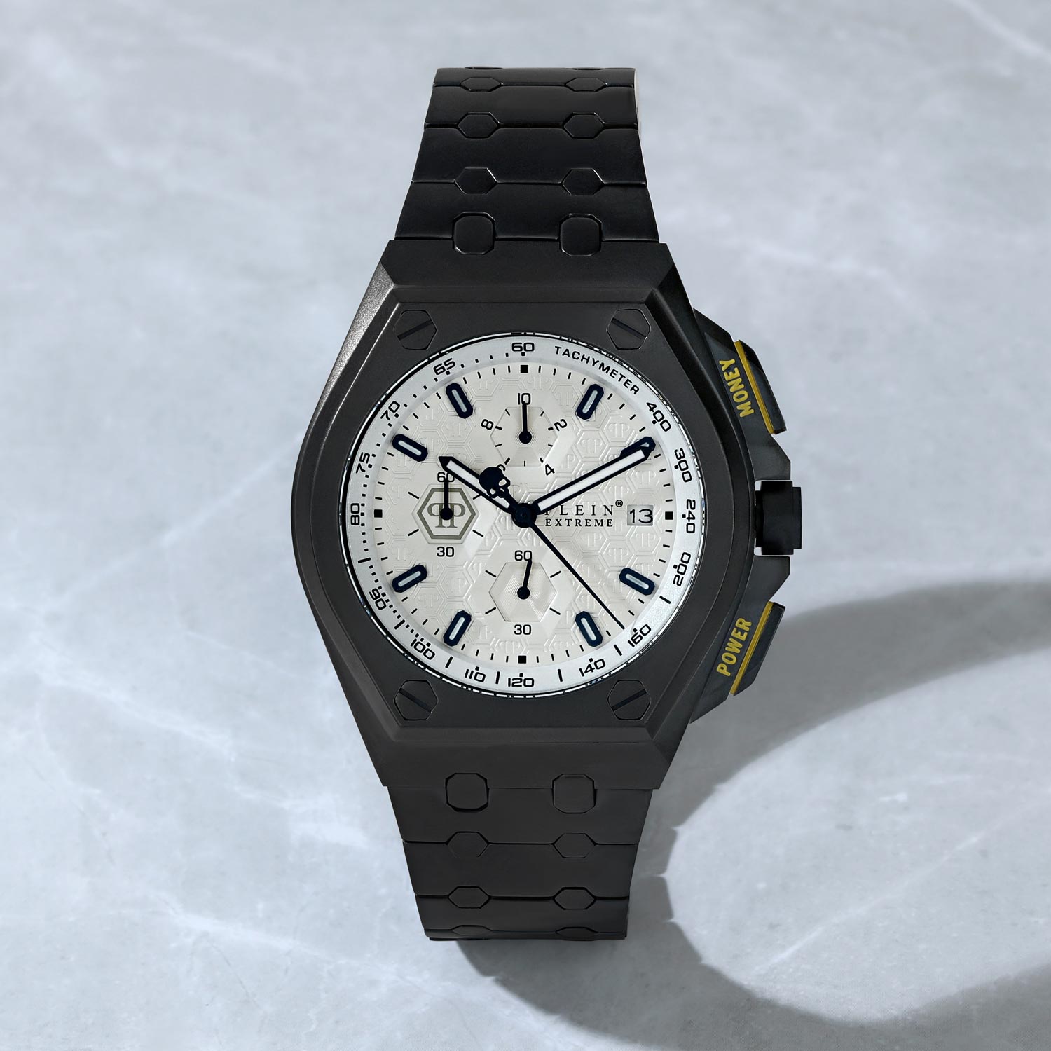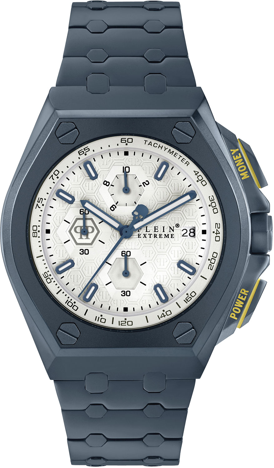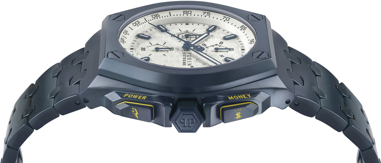Plein Extreme - для мужчины, который любит комфорт и спортивный вид. Эстетику геометрического дизайна придает острота конструкции корпуса. Детализированное исполнение делает эти часы, оснащенные механизмом хронографа, уникальными. Шестиугольный узор на фоне циферблата, винты, расположенные на безеле, определяют мужественный и неповторимый фирменный характер Plein. Экстремальность и максимализм - это мантра Philipp Plein, и почему бы не выразить это в более подчеркнутой форме через утверждение ''Власть'' и ''Деньги'', выгравированное на обеих кнопках желтым цветом. Логотип Philipp Plein красуется на силиконовом ремешке, а логотип в виде черепа - на обратной стороне ремешка. Эта деталь гарантирует изделию изысканность в исполнении деталей в соответствии с эстетикой Philipp Plein. Стань экстремальным с Philipp Plein! Plein Extreme. Кварцевые оригинальные наручные часы-хронограф с секундомером и тахиметром. Бочкообразный стальной корпус с минеральным стеклом. Циферблат украшен сотовым декоративным узором с паттерном в виде фирменного логотипа. Заостренные прямоугольные стрелки в стиле Baton. Метки в виде штрихов. Окошко даты находится в положении 3 часа. Граненая заводная головка с защитой. Надежный стальной браслет.