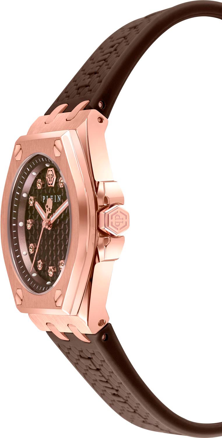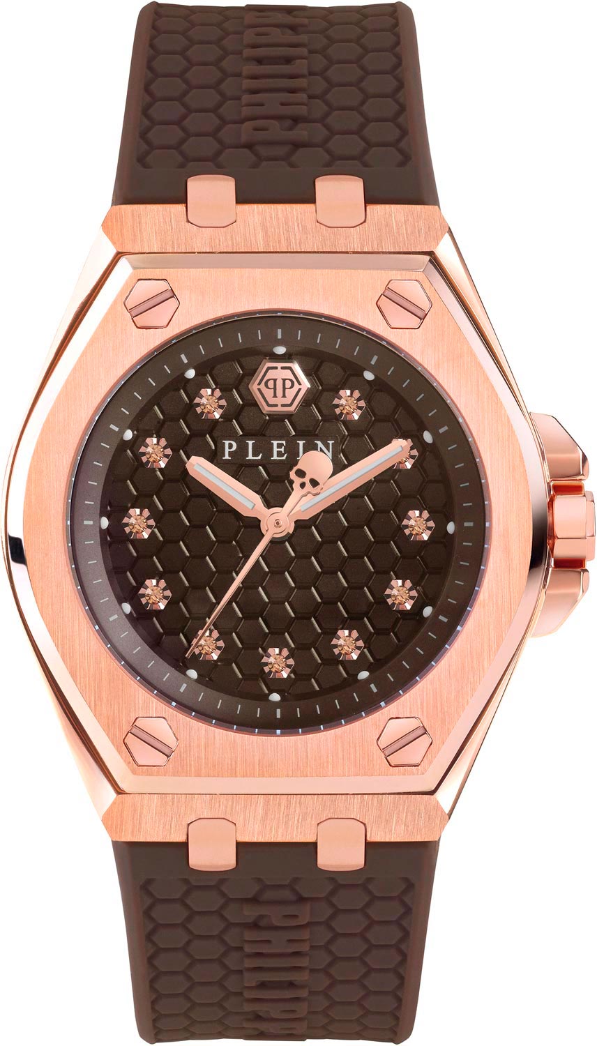 Своим оригинальным внешним видом и завораживающим блеском кристаллов эти часы, безусловно, привлекут внимание окружающих. Женские наручные часы Plein Extreme Lady. Стальной корпус украшен знаковыми винтами. Циферблат с шестиугольной текстурой с метками в виде точек украшенными коричневыми кристаллами Swarovski и логотипом ''PP'' в положении 12 часов. Заводная головка с защитой. Силиконовый ремешок с шестиугольной текстурой и тиснением логотипа Philipp Plein. Классическая застежка украшена черепом. Фирменная дизайнерская упаковка.