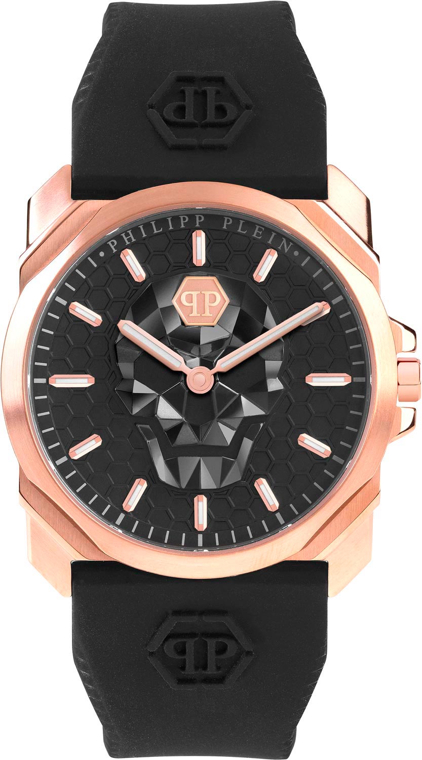 Мужские наручные часы The Skull King со стальным корпусом. Циферблат с шестиугольной текстурой с метками в виде штрихов украшен трехмерным граненым черепом. Заводная головка с защитой. Силиконовый ремешок украшен тиснением логотипа Philipp Plein. Классическая застежка украшена черепом. Фирменная дизайнерская упаковка.