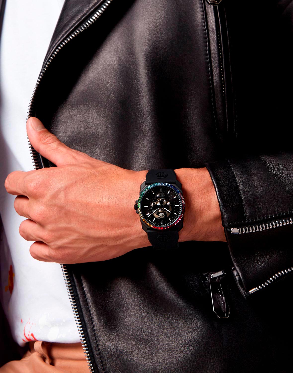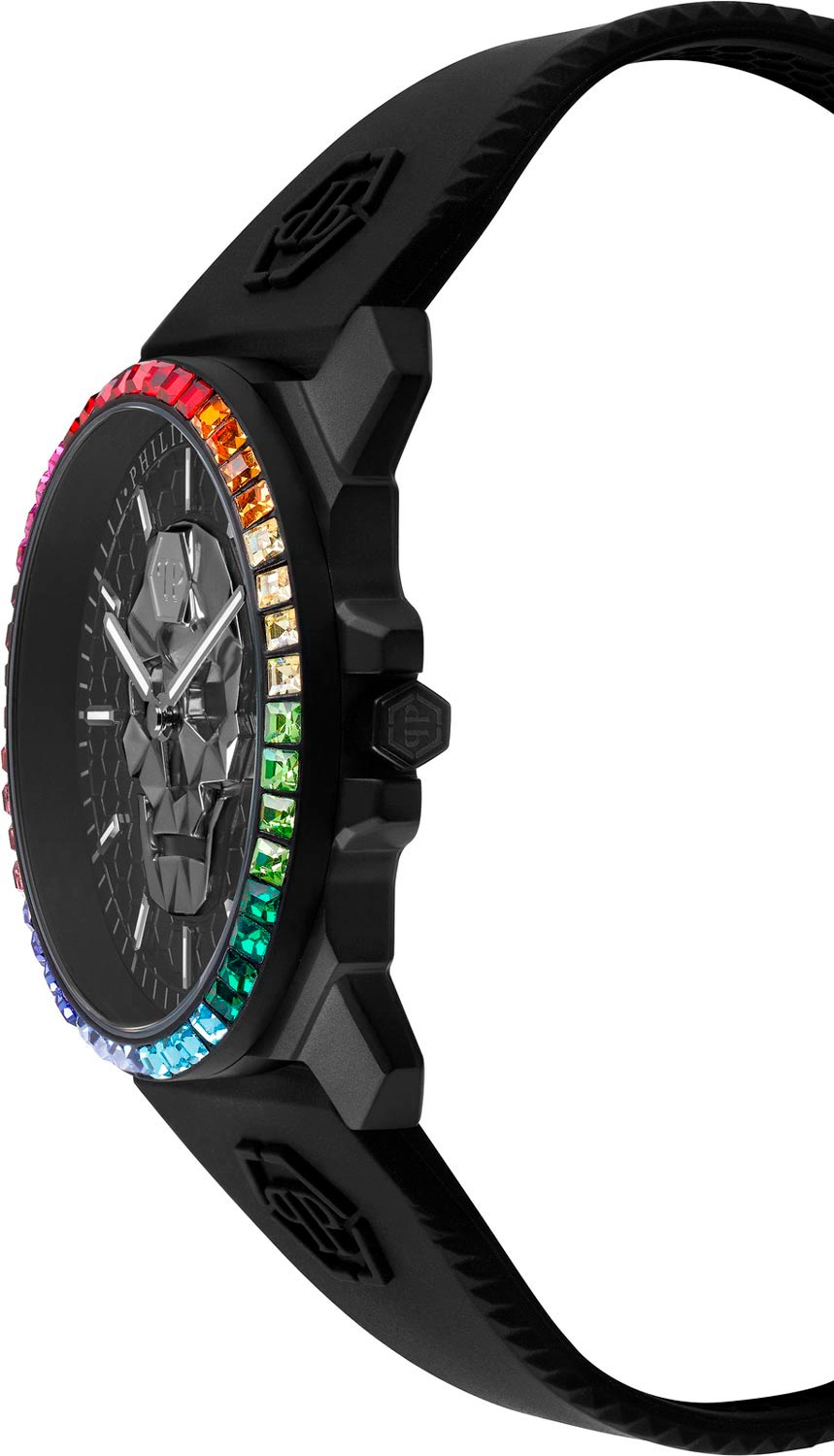 Мужские наручные часы The Skull King. Стальной корпус украшен разноцветными кристаллами. Циферблат с шестиугольной текстурой с метками в виде штрихов украшен трехмерным граненым черепом. Заводная головка с защитой. Силиконовый ремешок украшен тиснением логотипа Philipp Plein. Классическая застежка украшена черепом. Фирменная дизайнерская упаковка.