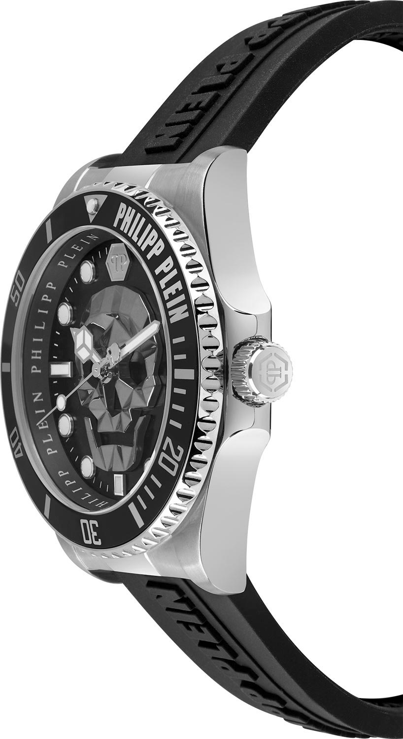 Быть стильным легко, когда ваше запястье украшают эти практичные часы от Philipp Plein. Идеальный выбор для тех, чья жизнь полна энергии и движения. Дайверские мужские часы The Skull Diver с круглым стальным корпусом. Циферблат с метками в виде штрихов и точек украшен трехмерным граненым черепом и логотипом ''PP'' в положении 12 часов. Заводная головка с защитой. Силиконовый ремешок украшен тиснением логотипа Philipp Plein. Классическая застежка украшена черепом. Фирменная дизайнерская упаковка.