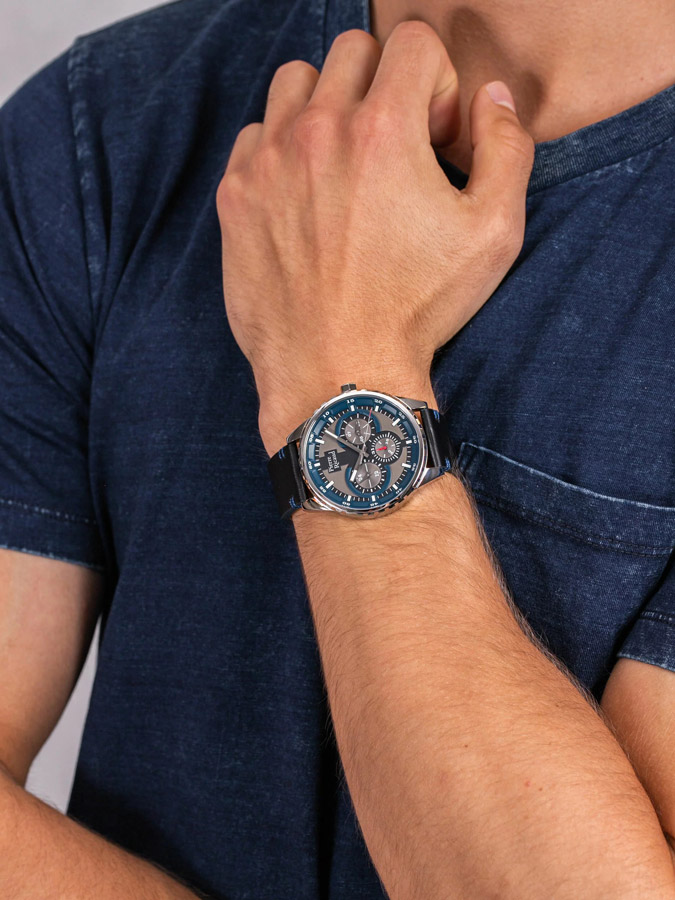 Эти функциональные часы придутся по вкусу ценителям практичных и стильных аксессуаров. Идеальный выбор для современного ритма жизни. Мужские наручные часы. 12-ти и 24-х часовой формат времени. Время в 24-х часовом формате, дата и день недели вынесены на отдельные циферблаты. Метки в виде штрихов. Ремешок из кожи с классической застежкой.