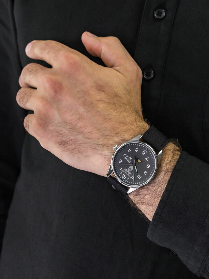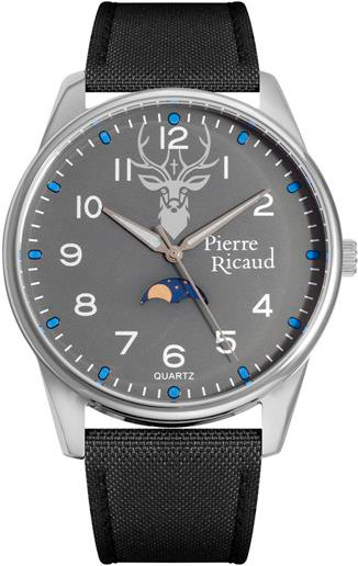 Современные мужские часы в классическом оформлении — отличный выбор для тех, кто ценит стиль и комфорт. Мужские наручные часы. Индикатор фазы Луны. Метки в виде арабских цифр. Стрелки с люминесцентным покрытием, которое светится в темноте после непродолжительной зарядки на свету. Рифленая заводная головка. Тканевый ремешок на кожаной основе с классической застежкой.