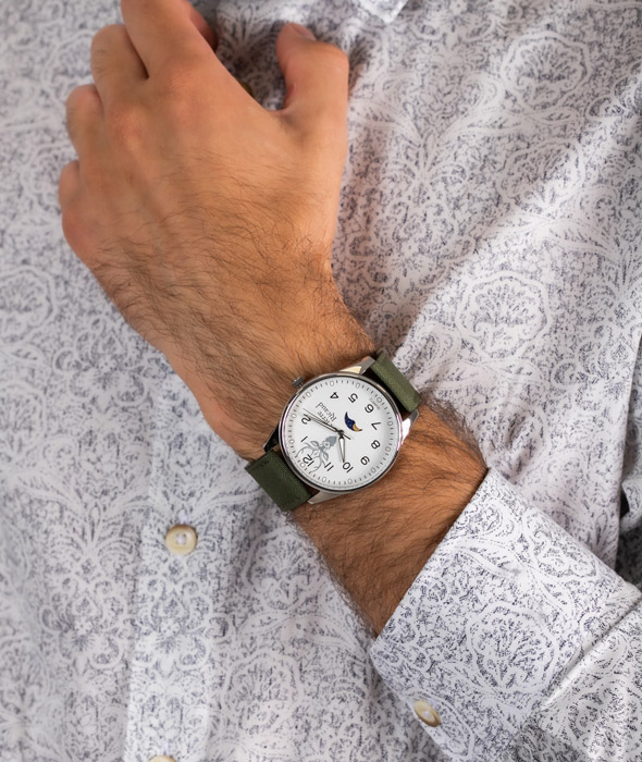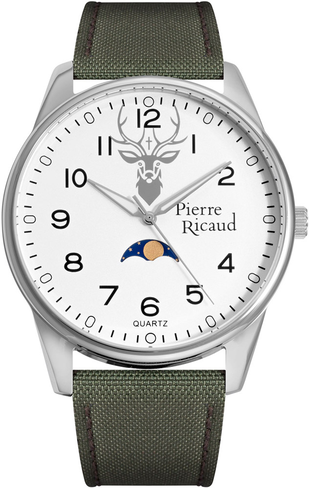 Современные мужские часы в классическом оформлении — отличный выбор для тех, кто ценит стиль и комфорт. Мужские наручные часы. Индикатор фазы Луны. Метки в виде арабских цифр. Стрелки с люминесцентным покрытием, которое светится в темноте после непродолжительной зарядки на свету. Рифленая заводная головка. Тканевый ремешок на кожаной основе с классической застежкой.