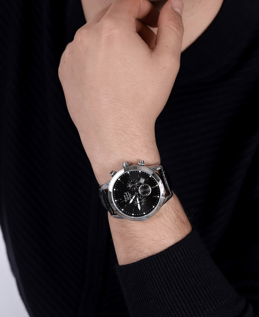 Стильные часы с функцией хронографа придутся по вкусу современным мужчинам, ведущим активный образ жизни. Мужские часы-хронограф с секундомером. 12-ти и 24-х часовой формат времени. Метки в виде штрихов. Окошко даты. Рифленая заводная головка. Кожаный ремешок с классической застежкой.