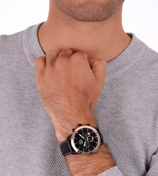 Стильные часы с функцией хронографа придутся по вкусу современным мужчинам, ведущим активный образ жизни. Мужские часы-хронограф с секундомером. 12-ти и 24-х часовой формат времени. Метки в виде штрихов. Окошко даты. Рифленая заводная головка. Кожаный ремешок с классической застежкой.