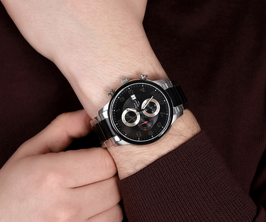 Стильные, надежные, многофункциональные. Эти часы - незаменимый атрибут для современных и уверенных в себе мужчин. Часы-хронограф с секундомером. 12-ти и 24-х часовой формат времени. Метки в виде арабских цифр. Окошко даты в положении 3 часа. Рифленая заводная головка. Браслет с раскладывающейся застежкой.