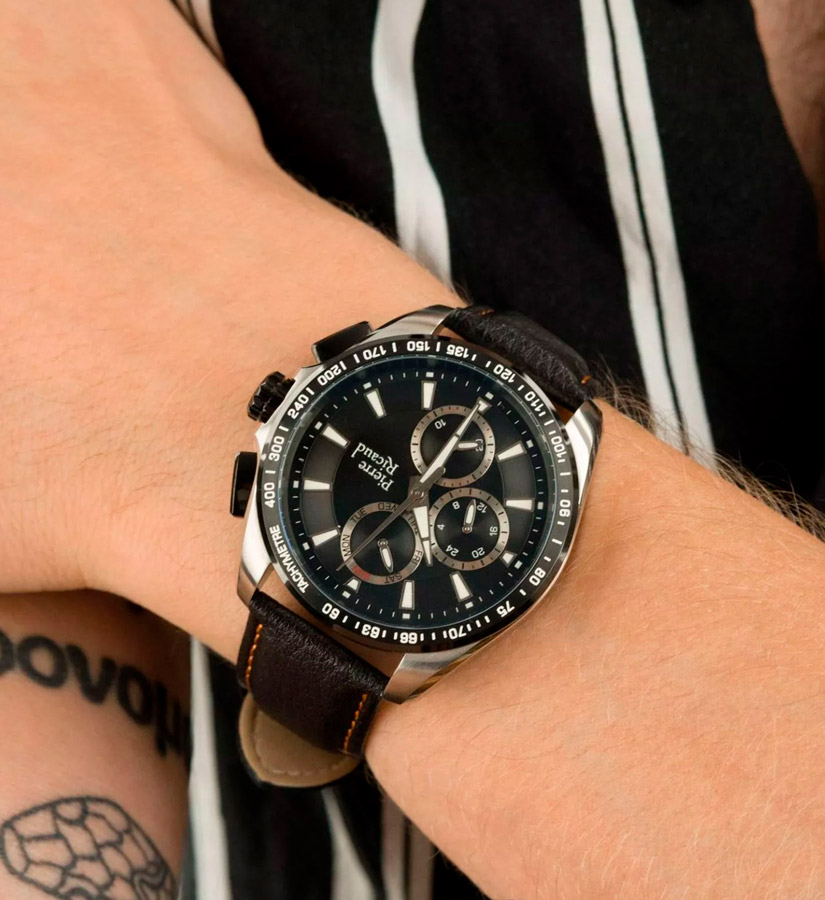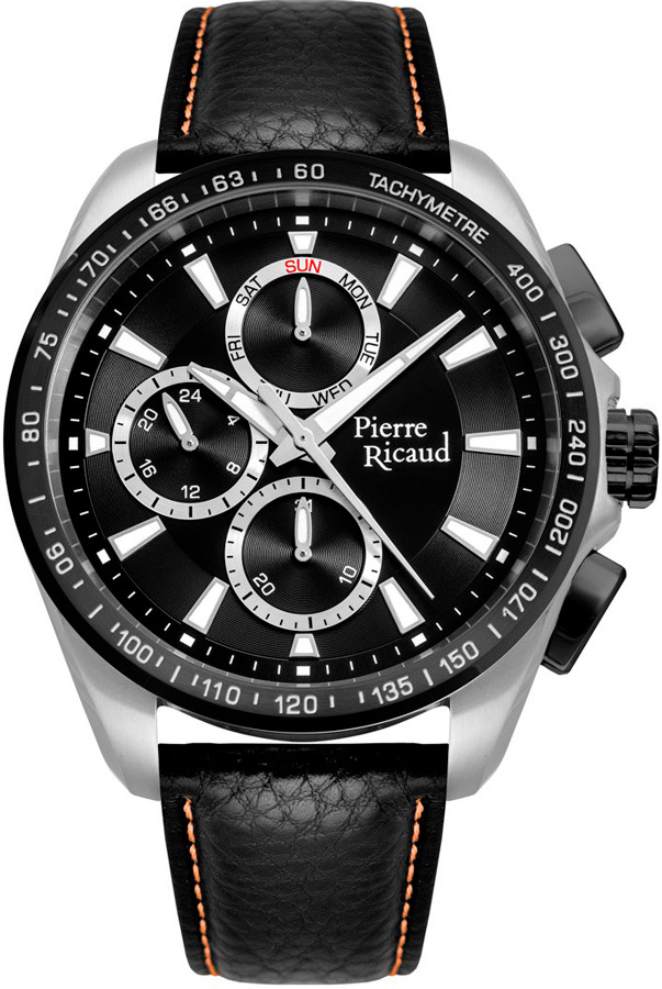 Выразительный дизайн этих часов оживит ваш повседневный образ и подчеркнет вашу индивидуальности. Мужские наручные часы с тахиметром. 12-ти и 24-х часовой формат времени. Время в 24-х часовом формате, дата и день недели вынесены на отдельные циферблаты. Кожаный ремешок с классической застежкой.