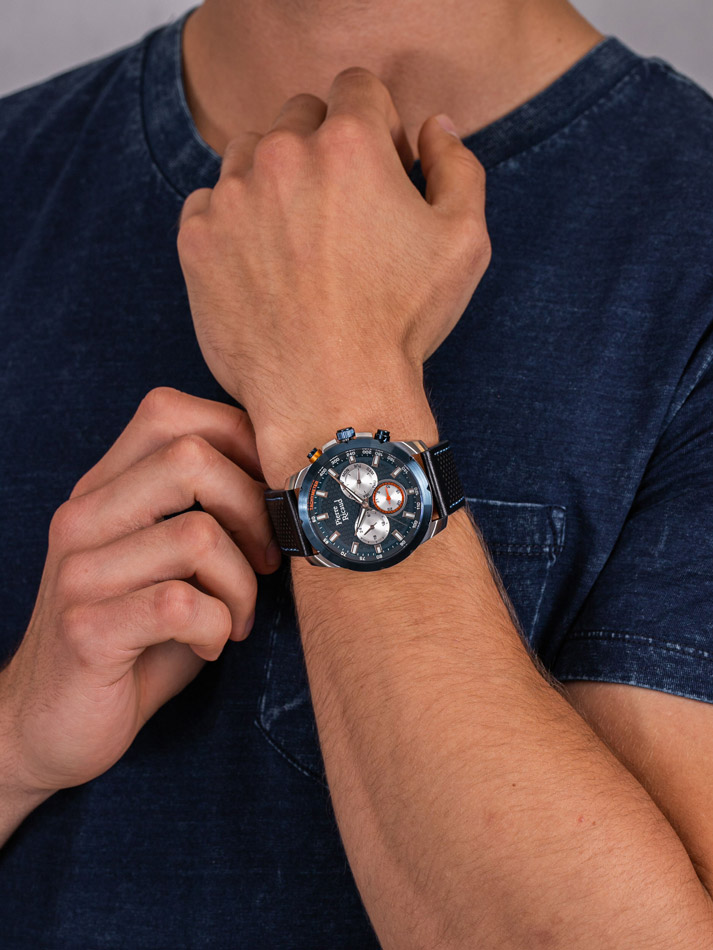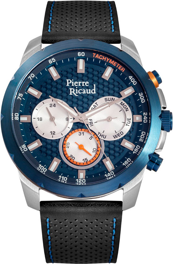 Эти функциональные массивные часы созданы для того, чтобы подчеркнуть образ настоящего мужчины. Мужские наручные часы с тахиметром. 12-ти и 24-х часовой формат времени. Время в 24-х часовом формате, дата и день недели вынесены на отдельные циферблаты. Рифленая заводная головка с защитой. Кожаный ремешок с классической застежкой.