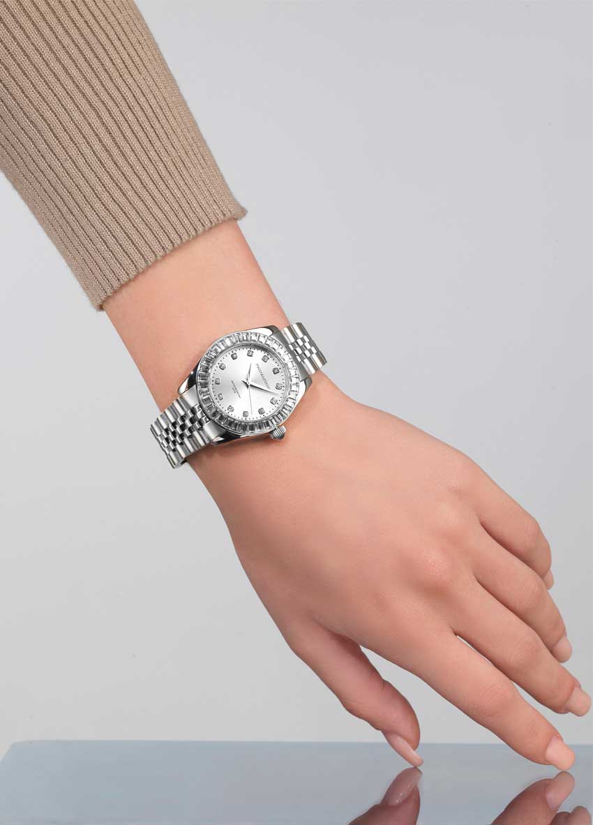Часы с завораживающим блеском кристаллов - аксессуар, благодаря которому можно стильно ориентироваться во времени. Наручные женские часы. Круглый стальной корпус украшен кристаллами. Циферблат выполнен по технологии Sunray (солнечные лучи). Накладные метки в виде точек, украшенных кристаллами. Острые стрелки в стиле Alpha. Рифленая заводная головка украшена кристаллом. Надежный стальной браслет матовой и полированной отделки с раскладывающейся застежкой.