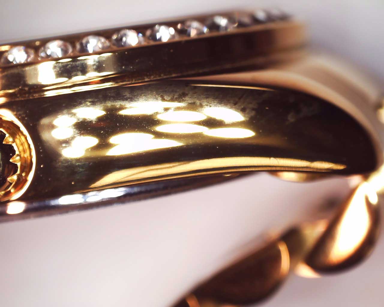 Наручные женские часы. Круглый стальной корпус украшен кристаллами. Циферблат выполнен по технологии Sunray (солнечные лучи) и украшен глиттерным логотипом фирмы. Накладные метки в виде штрихов. Заостренные прямоугольные стрелки в стиле Baton. Метки и стрелки с люминесцентным покрытием, которое светится в темноте после непродолжительной зарядки на свету. Рифленая заводная головка. Надежный стальной браслет матовой и полированной отделки с раскладывающейся застежкой.