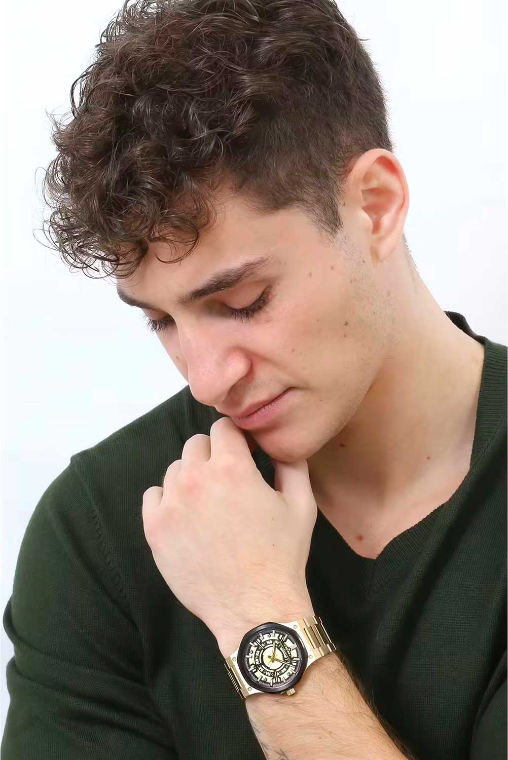 Этот стильный мужской аксессуар станет неповторимой деталью вашего современного имиджа. Наручные мужские часы. Круглый стальной корпус с восьмигранным безелем. Двухуровневый циферблат. Накладные метки в виде штрихов. Заостренные прямоугольные стрелки в стиле Baton. Метки и стрелки с люминесцентным покрытием, которое светится в темноте после непродолжительной зарядки на свету. Рифленая заводная головка. Надежный стальной браслет матовой и полированной отделки с раскладывающейся застежкой.