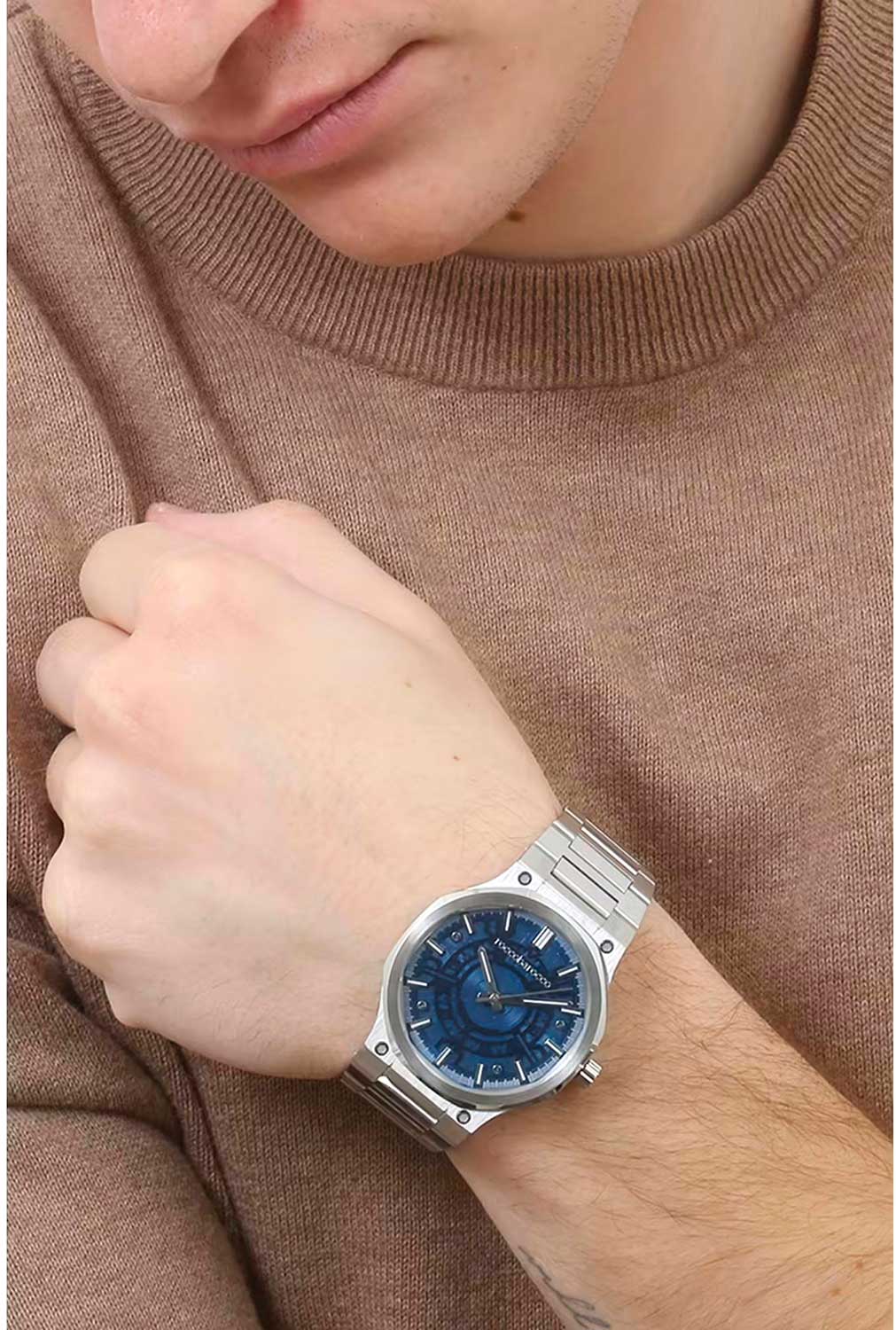 Наручные мужские часы. Круглый стальной корпус с восьмигранным безелем. Двухуровневый циферблат. Накладные метки в виде штрихов. Заостренные прямоугольные стрелки в стиле Baton. Метки и стрелки с люминесцентным покрытием, которое светится в темноте после непродолжительной зарядки на свету. Рифленая заводная головка. Надежный стальной браслет матовой и полированной отделки с раскладывающейся застежкой.