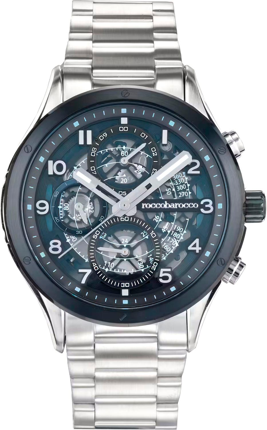 Мужские наручные часы-хронограф. Круглый стальной корпус с декоративным безелем украшенным винтами. Прозрачный циферблат. Метки в виде арабских цифр. Прямоугольные стрелки в стиле Baton. Метки и стрелки с люминесцентным покрытием, которое светится в темноте после непродолжительной зарядки на свету. Рифленая заводная головка. Надежный стальной браслет с раскладывающейся застежкой.