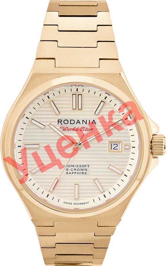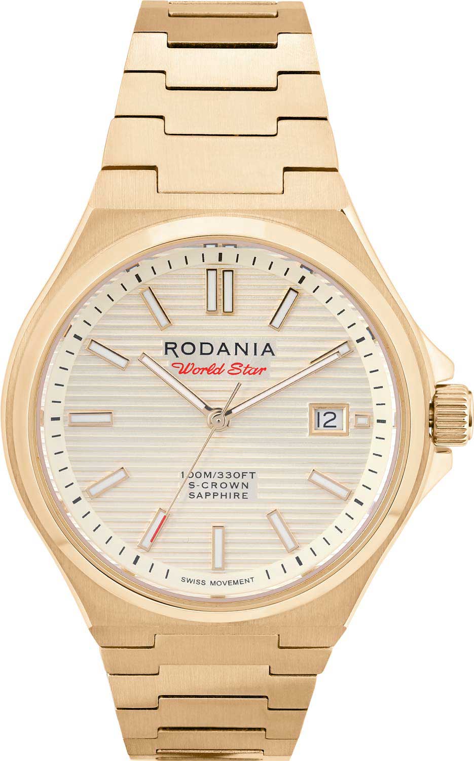 Компания Rodania отдает дань уважения своему наследию, выпустив модель часов, которая является современной интерпретацией классической модели 1974 года. Часы, воплощенные в винтажном дизайне корпуса с надежным швейцарским механизмом, олицетворяют вечную элегантность, переживая возрождение своего прошлого и направляясь к новым горизонтам в будущем. Мужские кварцевые часы World Star. Круглый сатинированный корпус из стали цвета желтого золота с полированным безелем. Золотистый циферблат с горизонтальным рельефным узором защищен прочным сапфировым стеклом. Метки в виде штрихов. Окошко даты находится в положении 3 часа. Рифленая заводная головка с защитой. На задней крышке выгравирована карта мира. Сатинированный стальной браслет цвета желтого золота с раскладывающейся застежкой.