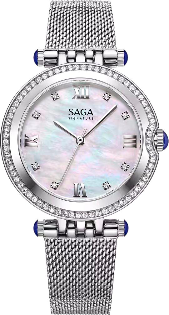 Ослепительный и манящий дизайн этих часов закружит вас в вихре стиля и безупречности. Элегантные женские часы с круглым стальным корпусом, украшенным кристаллами. Циферблат из натурального перламутра украшен логотипом Saga. Накладные метки в виде римских цифр и точек с кристаллами. Мечевидные стрелки в стиле Sword. Рифленая заводная головка. Задняя крышка украшена гравировкой. Стальной браслет миланского плетения.
