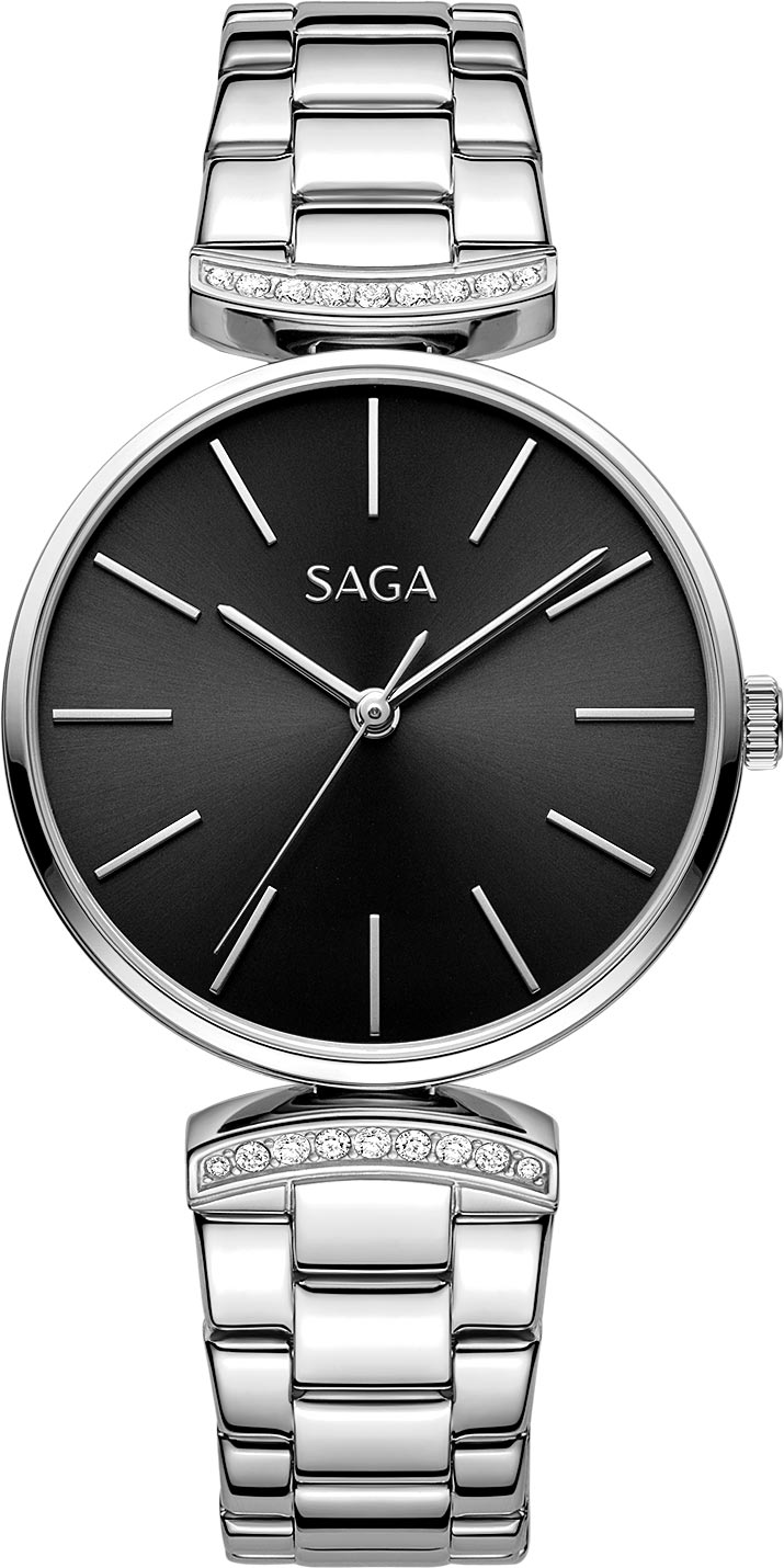 Эти великолепные часы прекрасно сочетают утонченность и элегантность. Дополните свой образ этим превосходным аксессуаром. Женские кварцевые часы с круглым стальным корпусом. Циферблат выполнен по технологии Sunray (солнечные лучи) и украшен логотипом Saga. Накладные метки в виде штрихов. Заостренные прямоугольные стрелки в стиле Baton. Рифленая заводная головка. Задняя крышка украшена гравировкой. Стальной браслет украшен кристаллами. Раскладывающаяся застежка.