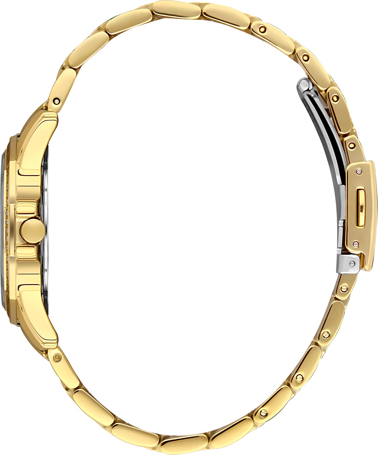 Интригующий дизайн циферблата и завораживающий блеск кристаллов - эти часы само воплощение женственности и шарма. Кварцевые женские наручные часы. Круглый корпус с 12-ти гранным безелем, украшенным кристаллами. Циферблат выполнен по технологии Sunray (солнечные лучи) и украшен фирменным логотипом. Накладные метки в виде штрихов. Стрелки с люминесцентным покрытием, которое светится в темноте после непродолжительной зарядки на свету. Заводная головка с защитой. Стальной браслет с раскладывающейся застежкой.