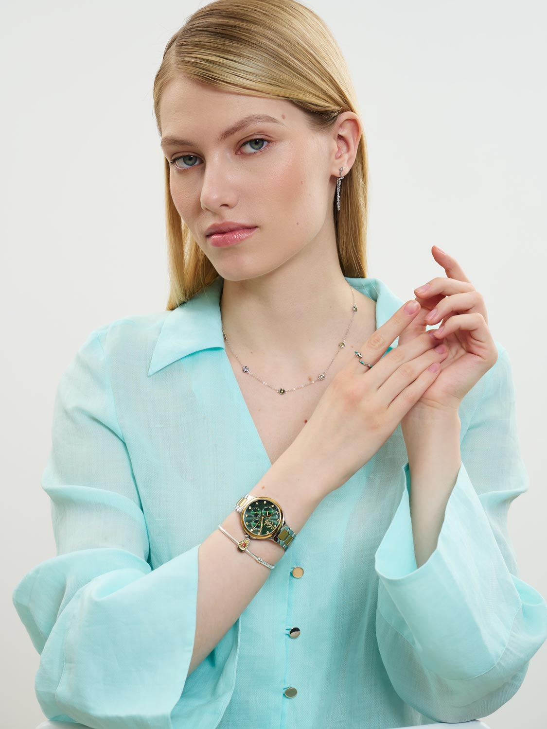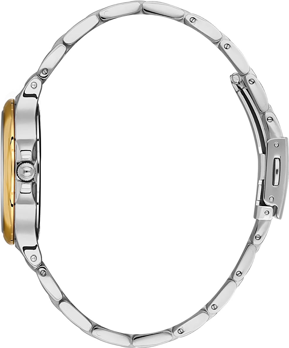 Эти нежные женские часы станут элегантным продолжением вашего легкого романтичного настроения. Женские наручные часы. Круглый корпус. Гильошированный циферблат украшен фирменным логотипом. Накладные метки в виде точек и арабской цифры 12. 12-ти и 24-х часовой формат времени, дата и день недели отображаются на отдельных циферблатах. Рифленая заводная головка с защитой. Стальной браслет с раскладывающейся застежкой.