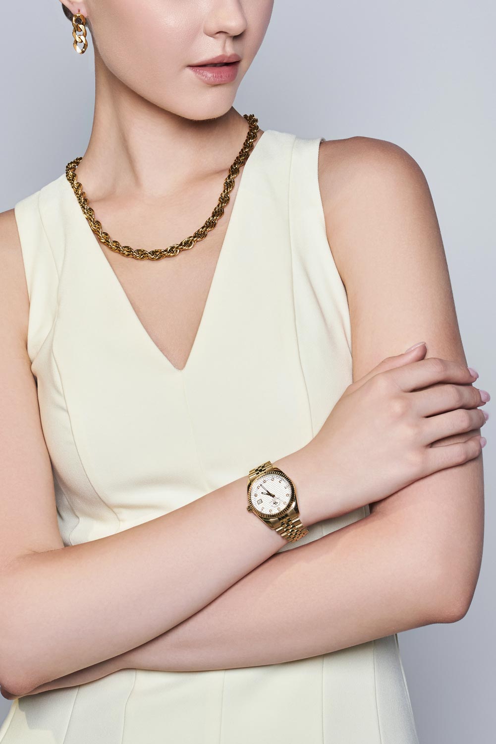 Эффектный циферблат и неотразимый блеск камней делают этот аксессуар особенно привлекательным и обольстительным. Женские наручные часы. Круглый корпус с рифленым безелем. Структурный циферблат с накладными метками в виде точек, украшенных кристаллами. Окошко даты находится в положении 3 часа. Стрелки с люминесцентным покрытием, которое светится в темноте после непродолжительной зарядки на свету. Рифленая заводная головка. Стальной браслет с раскладывающейся застежкой.