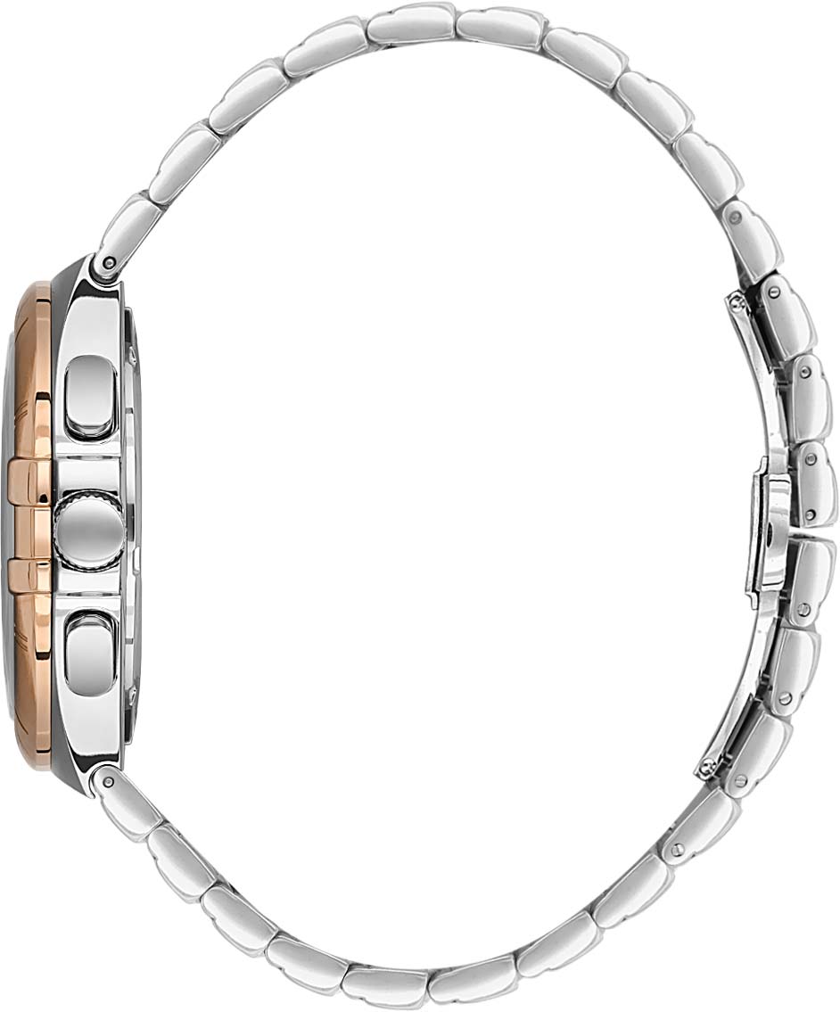 Функциональные наручные мужские часы. Круглый стальной корпус с матовой и полированной отделкой. Безель с римскими цифрами. 12-ти и 24-х часовой формат времени. Дата и день недели вынесены на отдельные циферблаты. Матовый циферблат и украшен фирменным логотипом. Накладные метки в виде штрихов. Клиновидные стрелки в стиле Dauphine с люминесцентным покрытием, которое светится в темноте после непродолжительной зарядки на свету. Рифленая заводная головка. Надежный стальной браслет с матовой и полированной отделкой. Раскладывающаяся застежка.