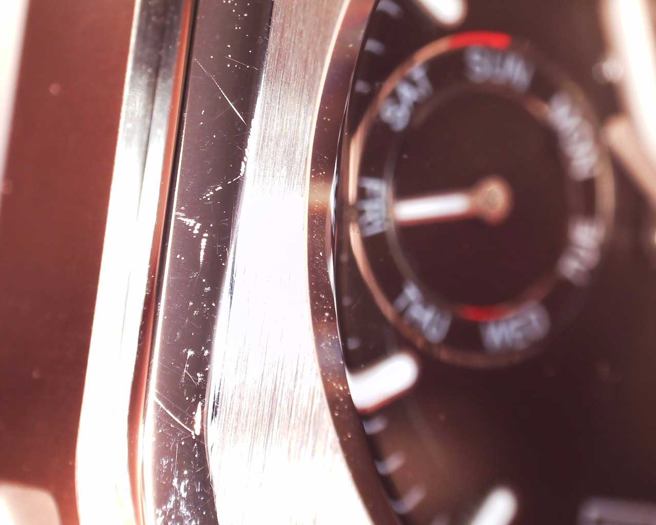 Функциональные мужские наручные часы. Квадратный стальной корпус с матовой и полированной отделкой. Декоративный безель на 4-х болтах. Циферблат выполнен по технологии Sunray (солнечные лучи) и украшен фирменным логотипом. Накладные метки в виде штрихов. 12-ти и 24-х часовой формат времени. День недели вынесен на отдельный циферблат. Окошко даты находится в положении 6 часов. Скругленные прямоугольные стрелки в стиле Baton. Стрелки и метки с люминесцентным покрытием, которое светится в темноте после непродолжительной зарядки на свету. Заводная головка с защитой, выполнена в форме болта. Надежный стальной браслет с матовой и полированной отделкой. Раскладывающаяся застежка.