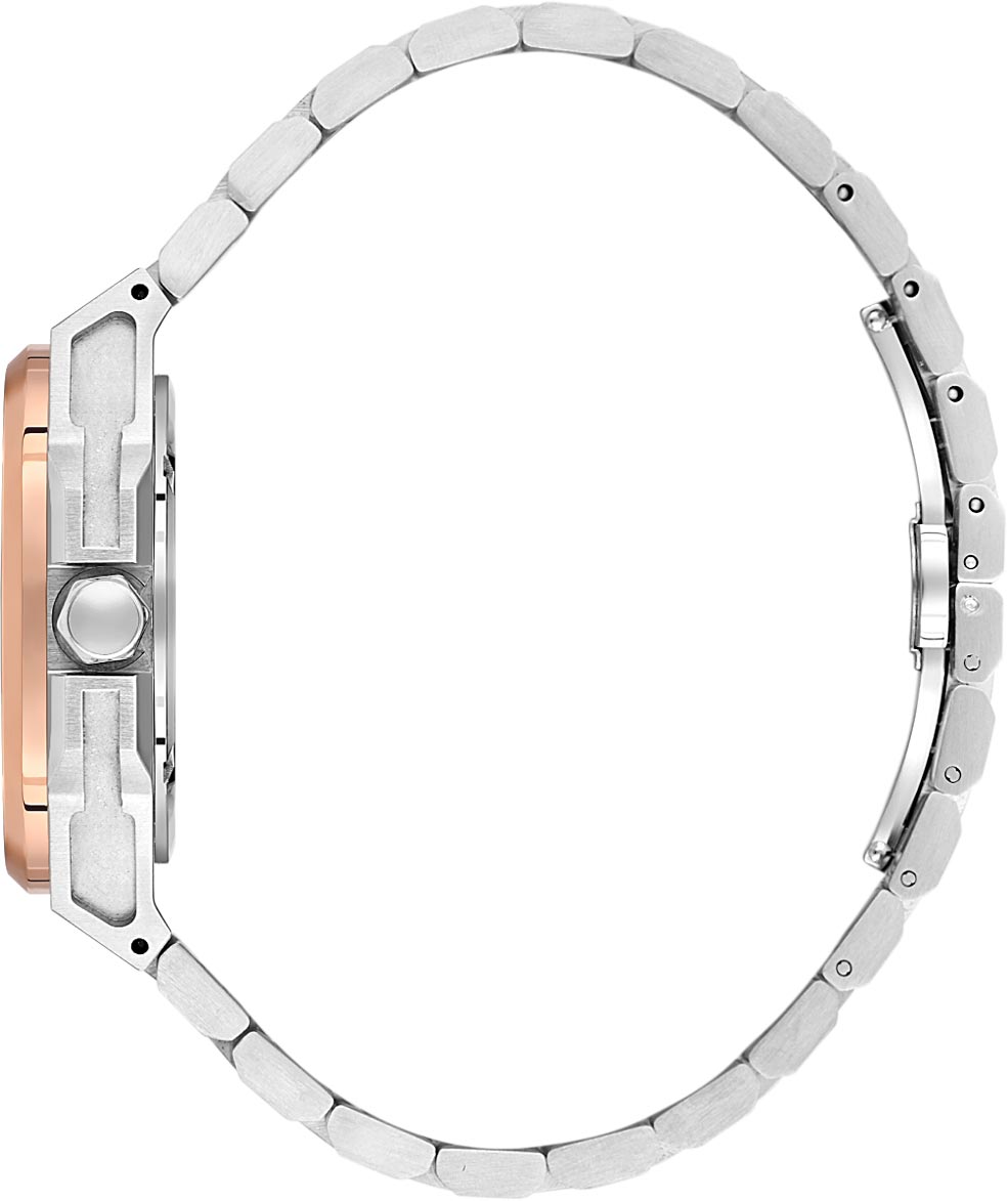 Выразительный дизайн, высокая функциональность и практичное оформление - обладатель таких часов никогда не теряет головы. Функциональные мужские наручные часы. Квадратный стальной корпус с матовой и полированной отделкой. Декоративный безель на 4-х болтах. Циферблат выполнен по технологии Sunray (солнечные лучи) и украшен фирменным логотипом. Накладные метки в виде штрихов. 12-ти и 24-х часовой формат времени. День недели вынесен на отдельный циферблат. Окошко даты находится в положении 6 часов. Скругленные прямоугольные стрелки в стиле Baton. Стрелки и метки с люминесцентным покрытием, которое светится в темноте после непродолжительной зарядки на свету. Заводная головка с защитой, выполнена в форме болта. Надежный стальной браслет с матовой и полированной отделкой. Раскладывающаяся застежка.