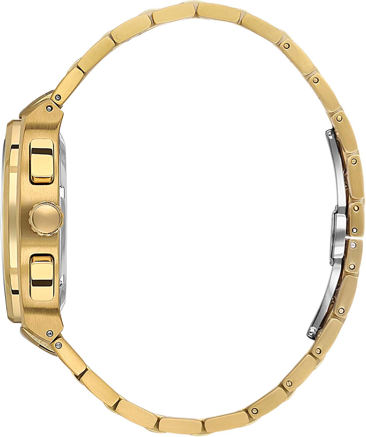 Мужские наручные часы. Циферблат с метками в виде штрихов. Окошко даты находится в положении 6 часов. 12-ти и 24-х часовой формат времени, второй часовой пояс вынесены на отдельные циферблаты. Рифленая заводная головка. Надежный стальной браслет с раскладывающейся застежкой.